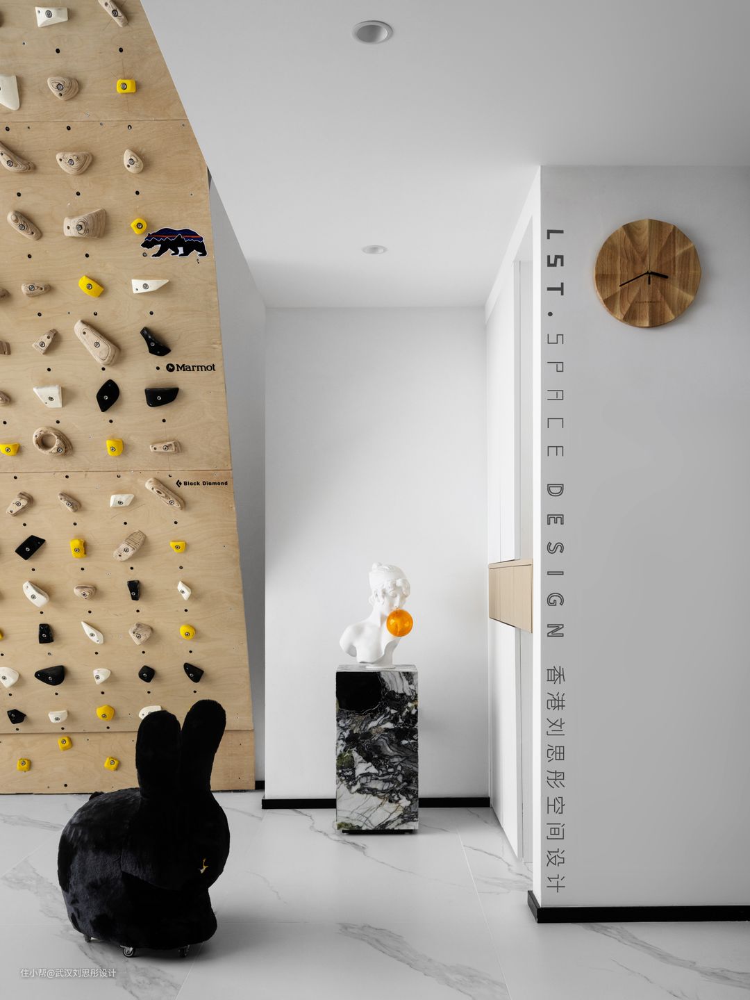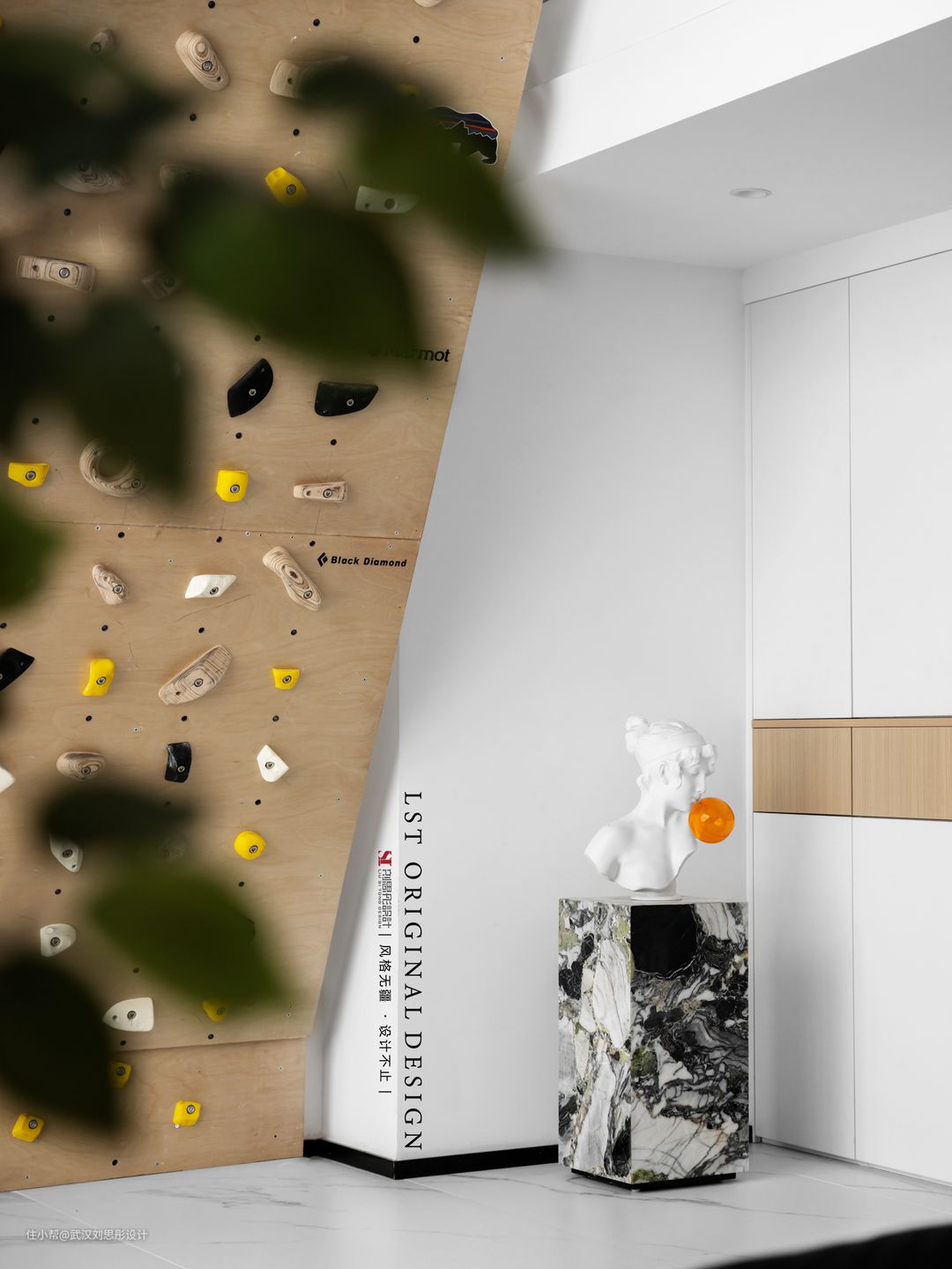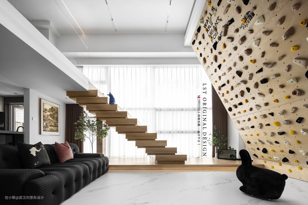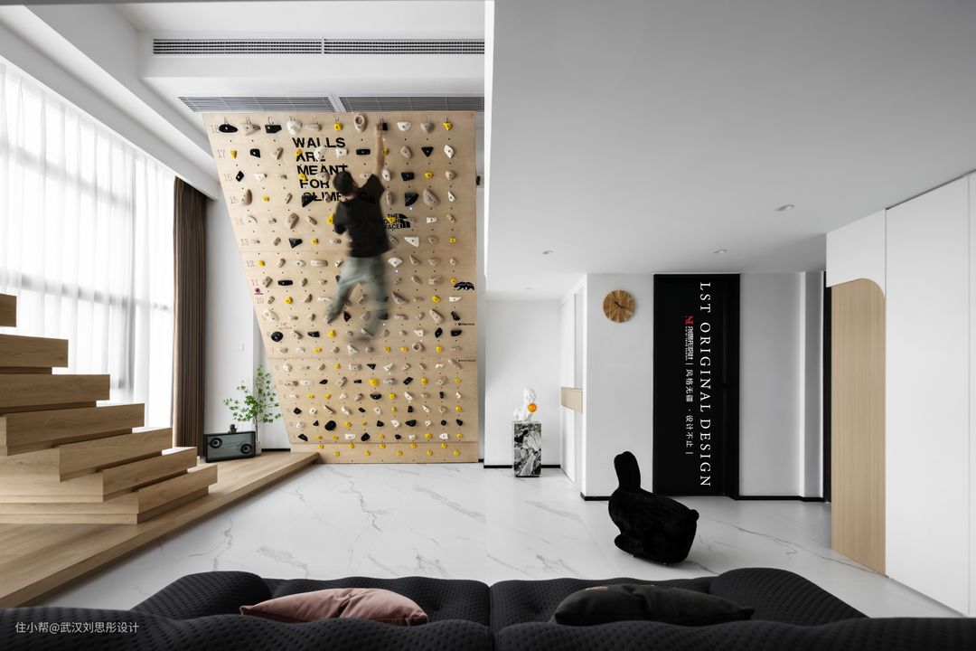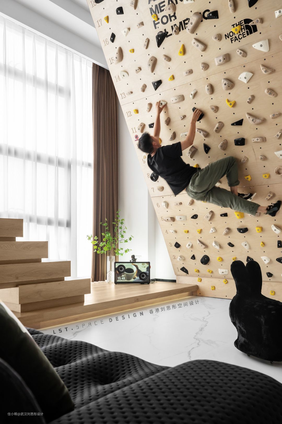 🧗♂️攀岩,是一个连动全身肌群的极限运动,也是一场脑与力的攻防。 🚩以攀岩为主的生活空间,破除了居家惯有的场域定义,没有明确的客餐厅的划分,也没有攀岩活动区的分野,开放式的布局,让空间获得更明亮的光线和更开阔的视野。 🚩客厅利用loft的挑空优势,靠墙设置攀岩墙,与楼梯地台衔接,略微倾斜的角度为攀岩带来更大的阻力和挑战; 🚩整个空间以大白墙为主,无主灯吊顶+鱼肚白哑光砖+原木色地台和堆叠楼梯,搭配精致时尚的深色家具和采光充足的落地窗,打造出极致通透的自由感和高级感。