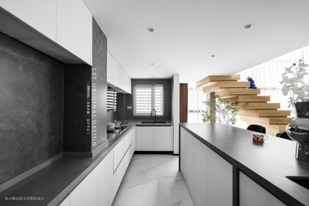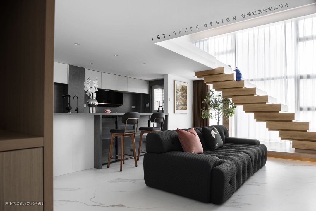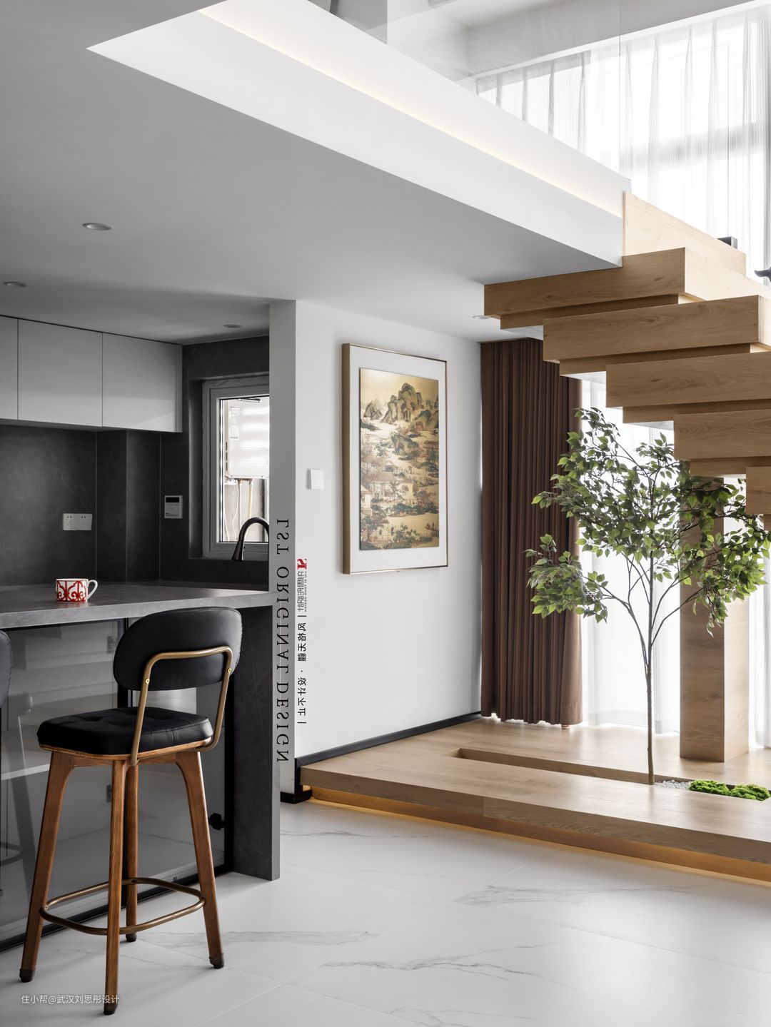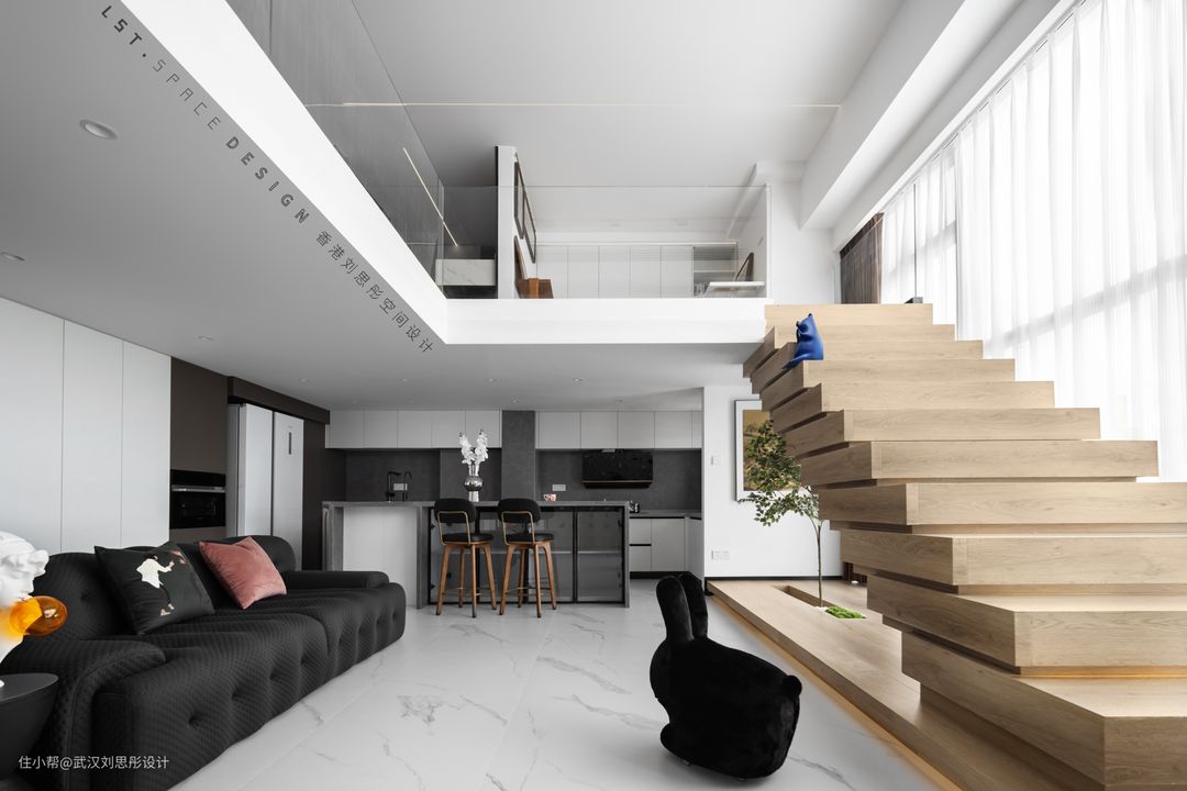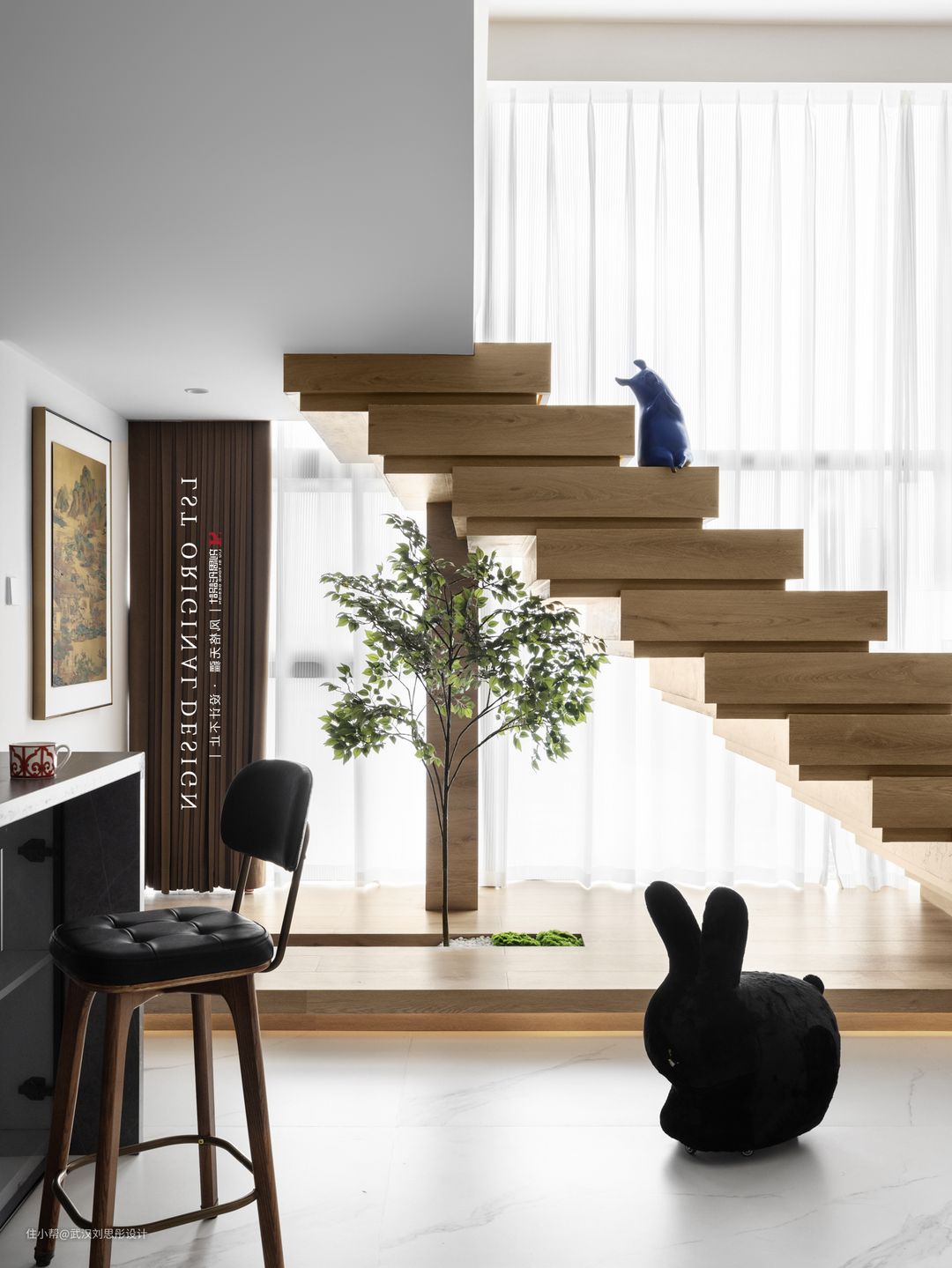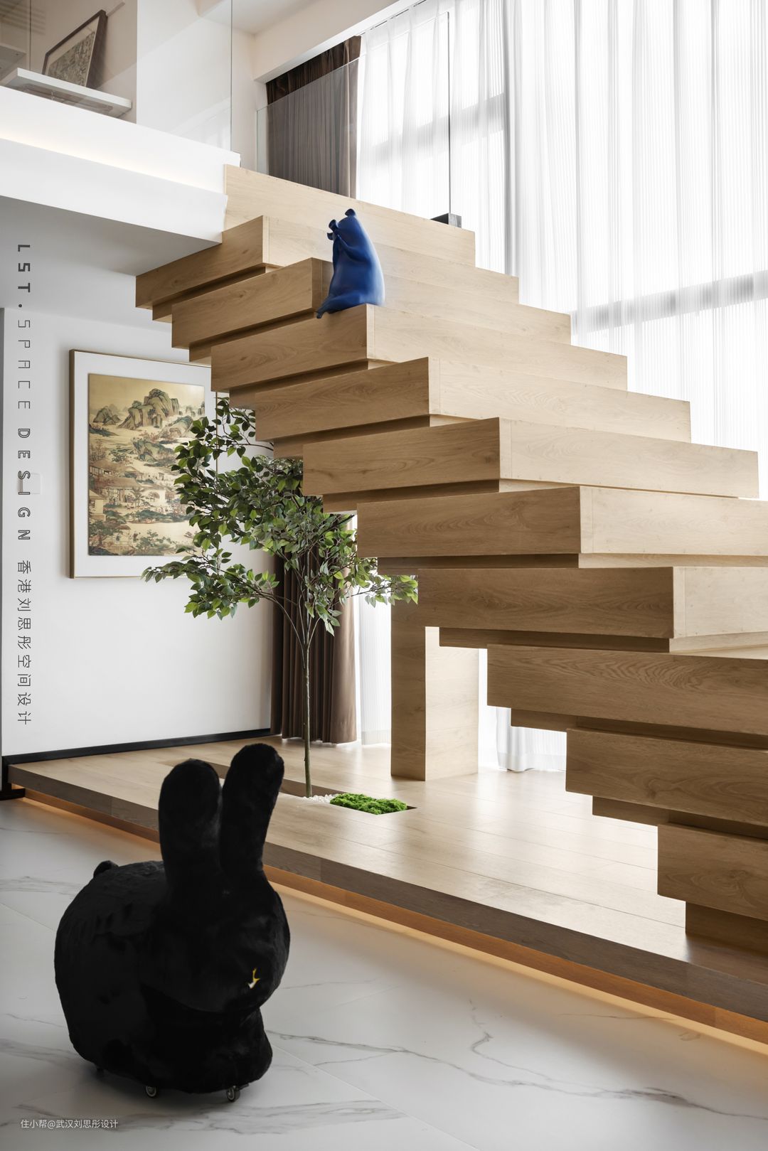 ❤在空间的优化上进行重新分配,将封闭狭窄的楼梯移到窗边,给予空间崭新的格局,延伸视野的同时,达到光线通透明亮的效果。 🎶木质地台作为楼梯起步,并暗藏灯带,加之悬浮感和层次感十足的堆叠楼梯,将现代主义与几何美学完美结合,灵动又高级,赋予空间独特的美感。