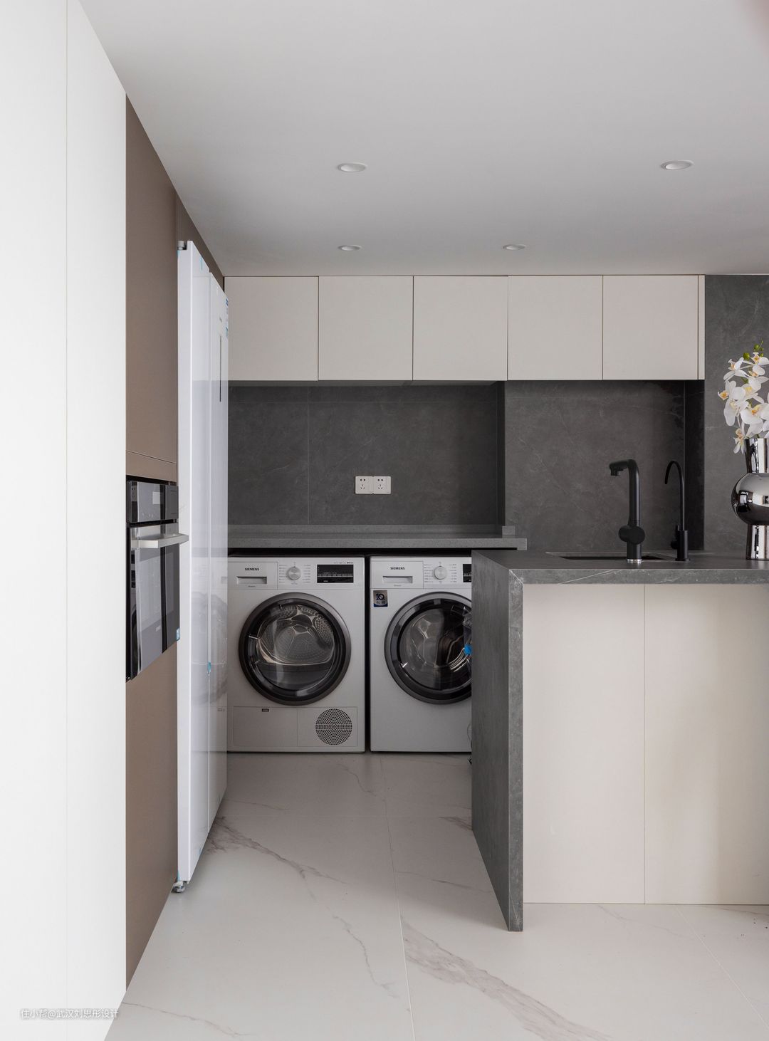 🚩鱼肚白哑光砖通铺到厨房,深灰色岩板上墙,搭配白色橱柜和同款岩板台面,形成深浅对比,柜门无拉手设计让整个厨房更加极简又大气!
