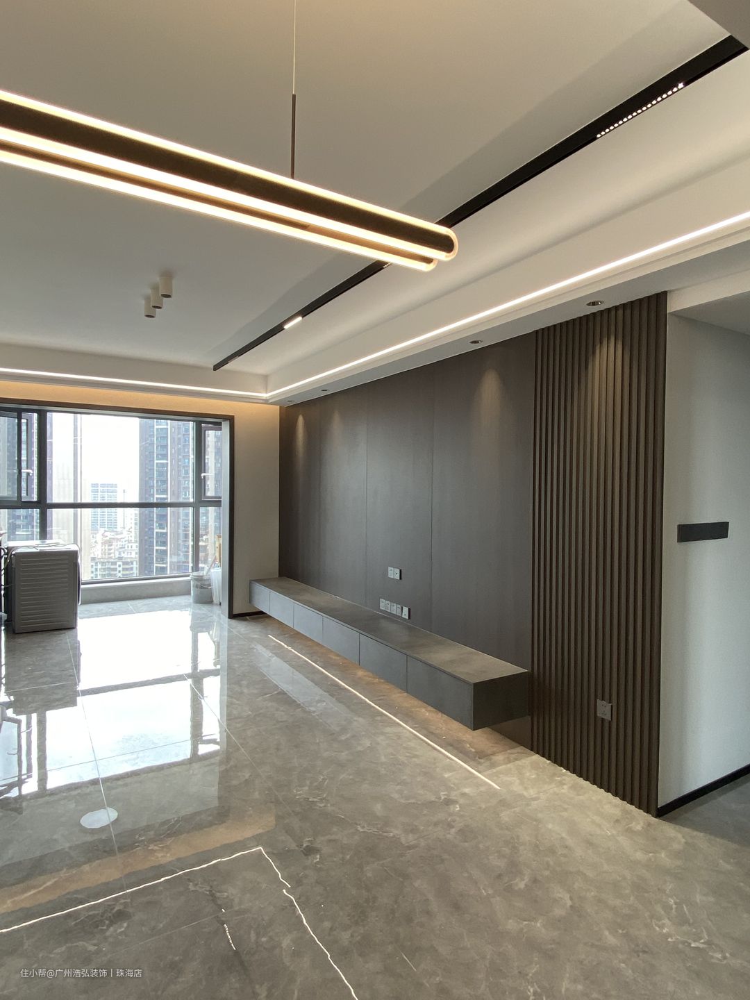 客厅顶面用的几种光源方式来保持空间的亮度,后面在辅以钓鱼灯,洗墙灯来增加空间光源多样性。背景墙使用木饰面+格栅+悬浮地台,富有满满的现代化气息