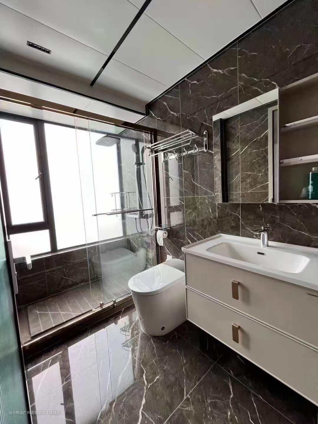 卫生间做常规干湿分离,深灰色墙地面,大理石拉槽,高级感满满
