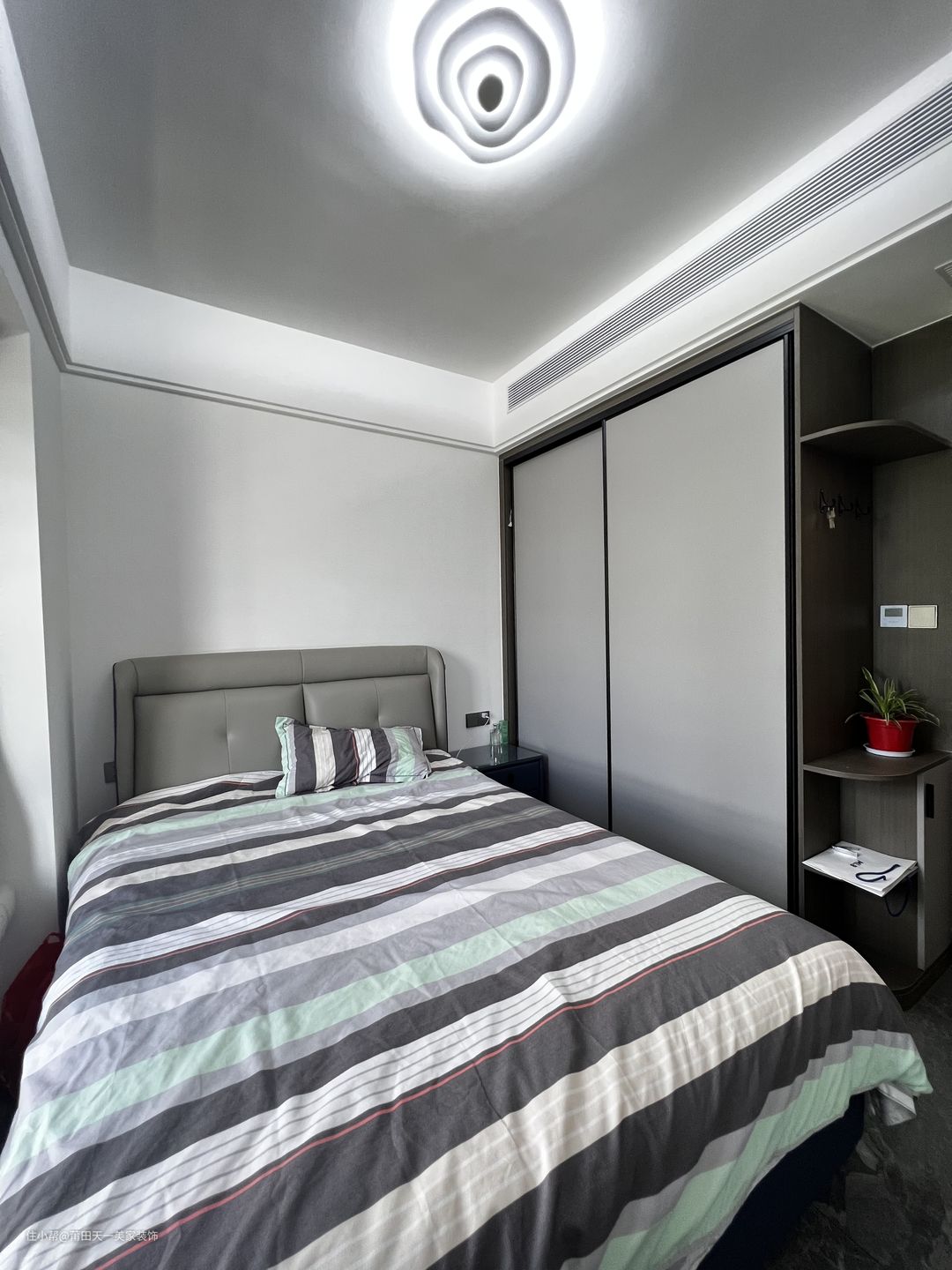 主卧的整体布局以灰色系为主调,浅灰色的硬包床头搭配奶白色的背景板,营造出一种简约又舒适的休息空间。造型别致的吸顶灯搭配双眼皮吊顶充满设计感,左边定制一门到顶的深浅灰色衣柜+边柜,既满足了收纳的功能需求,又可以起到储物与展示的作用。