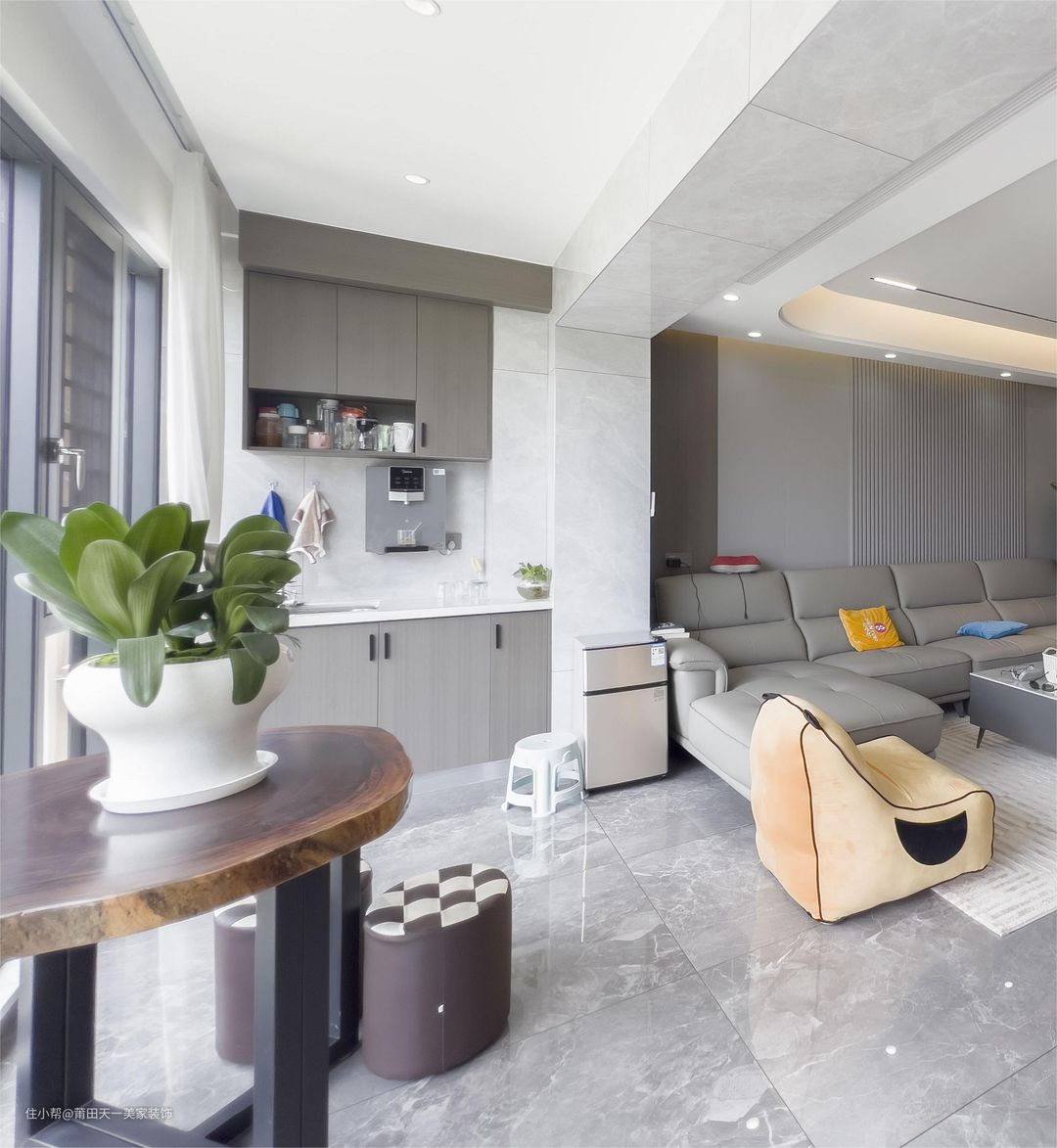 设计师在阳台处放置了一张不规则的实木桌子,并搭配两张卡其色的格子皮质圆凳椅,清晰明了地为业主划分出了一处休闲的会客区域。在阳台的右面,设计师靠墙定制了一个储物柜+洗手池的组合定制柜,既能储存食品和茶叶,又能方便清洗各种东西。
