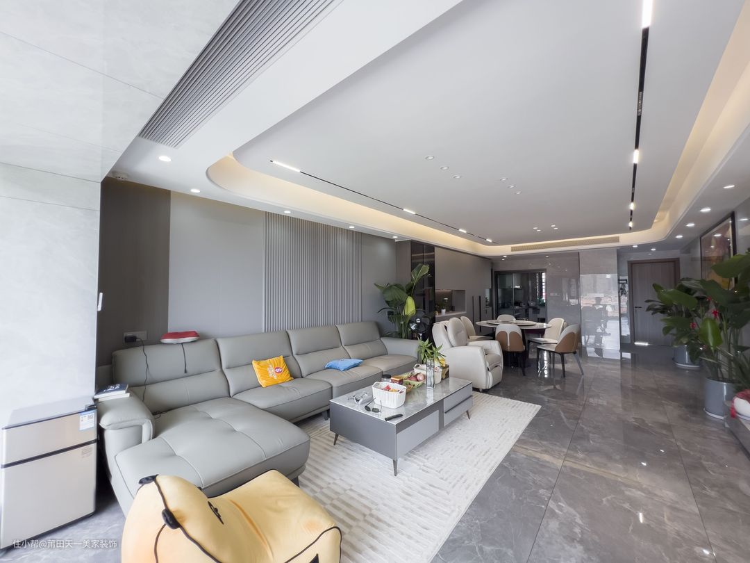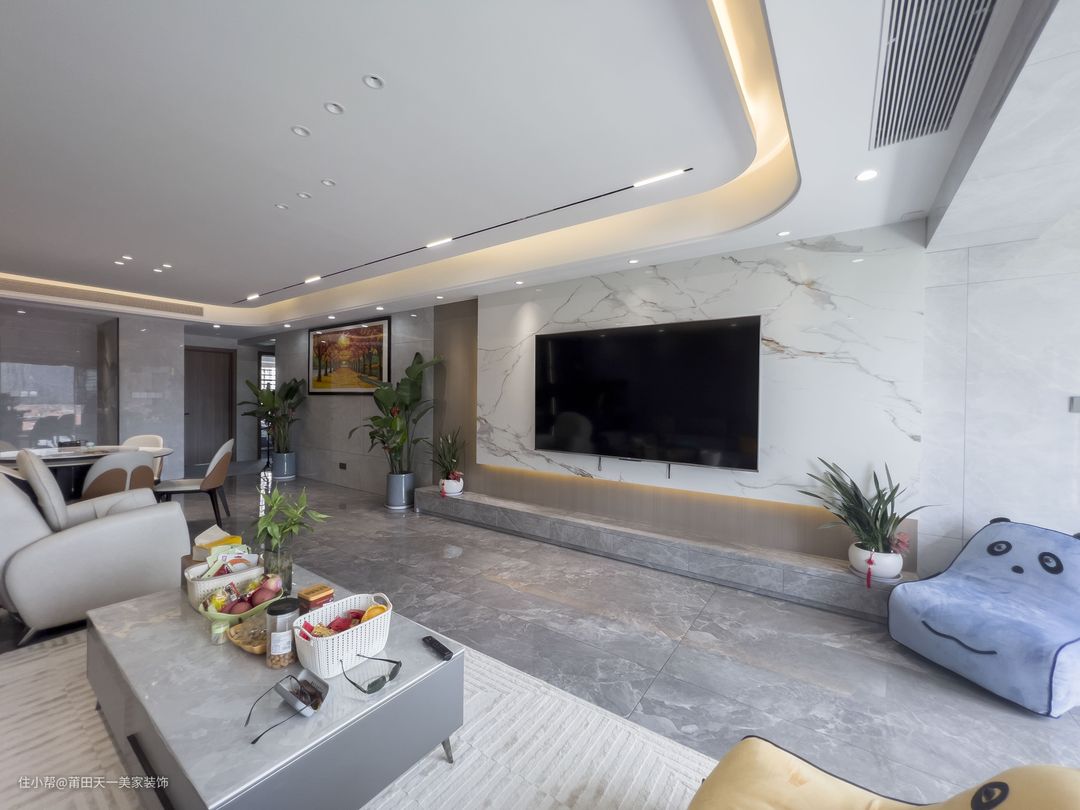客厅采用无主灯设计,整体以极简灰白配色搭配天花板轨道灯+灯带的设计,勾勒出了一个极简大方、现代简约的客厅空间。电视背景墙采用浅色系的山水纹岩板,搭配豪华大尺寸的电视,超大的屏幕的设计不仅大大地提高业主一家看电视的幸福感,而且还能减缓追剧时眼睛的疲惫感。灰色通铺地砖搭配浅色系的艺术波浪纹地毯与极简空间相呼应,姜黄色与雾霾蓝的卡通沙发不经意间冲淡了极简灰色带来的沉闷感。靠墙布置上浅灰色的沙发、搭配方形的山水纹岩板茶几,让空间充满低调大方又高级时尚的气息。