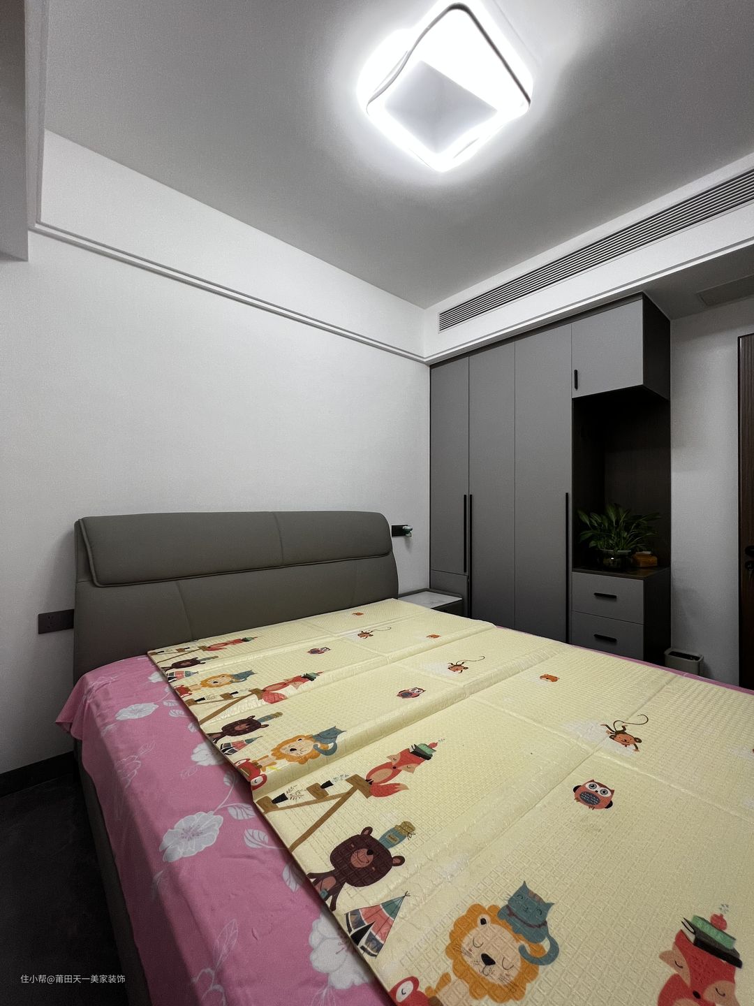 儿童房同样以灰色调作为房间的主色调,铅灰色的软包床头搭配治愈系的卡通床垫,造型新颖的吸顶灯搭配双眼皮吊顶,整体营造出一种时尚简约又有活力的休息空间。左边定制一门到顶的灰色衣柜+储物柜,充分满足了孩子的衣物收纳和储存物品的功能需求。