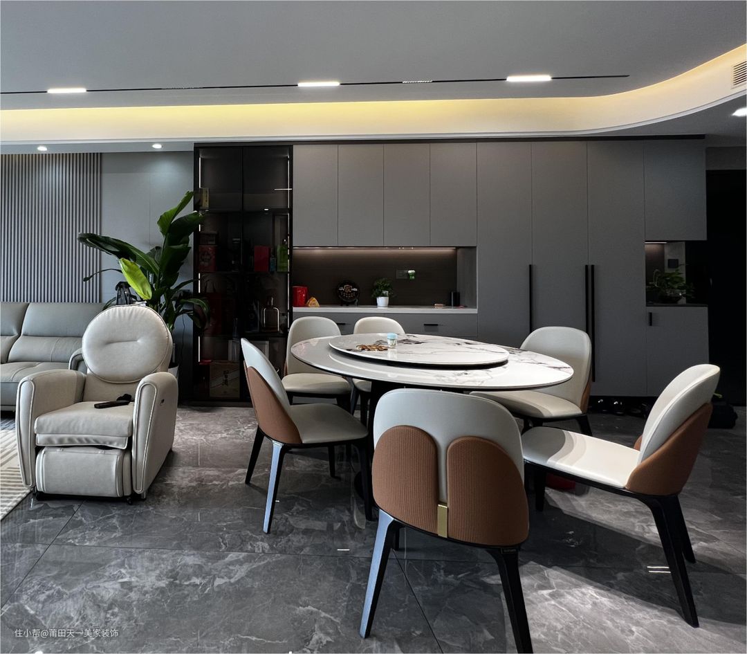 客餐厅一体化的设计,让餐厅的用餐空间从视觉上增大了一倍。设计师在餐厅中间摆上一张浅色系山水纹的双层可移动的岩板餐桌,搭配六张暖色调的皮艺餐椅,营造出一个高级舒适的用餐氛围;餐厅左边定制了一体化的浅白色餐边柜+玄关柜,柜子中间掏空设计方便随手置物,上下层的柜子用于收纳物品,整体美观又大气。这样的餐厅布置为业主一家打造了一个温馨融洽又充满格调的用餐空间。