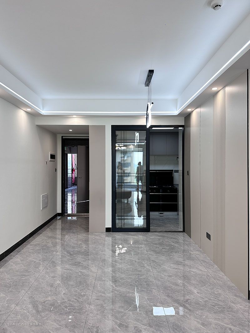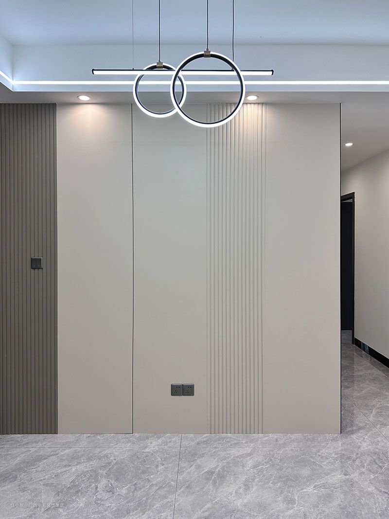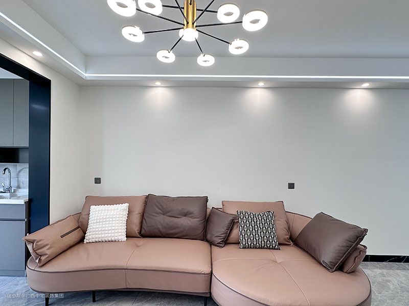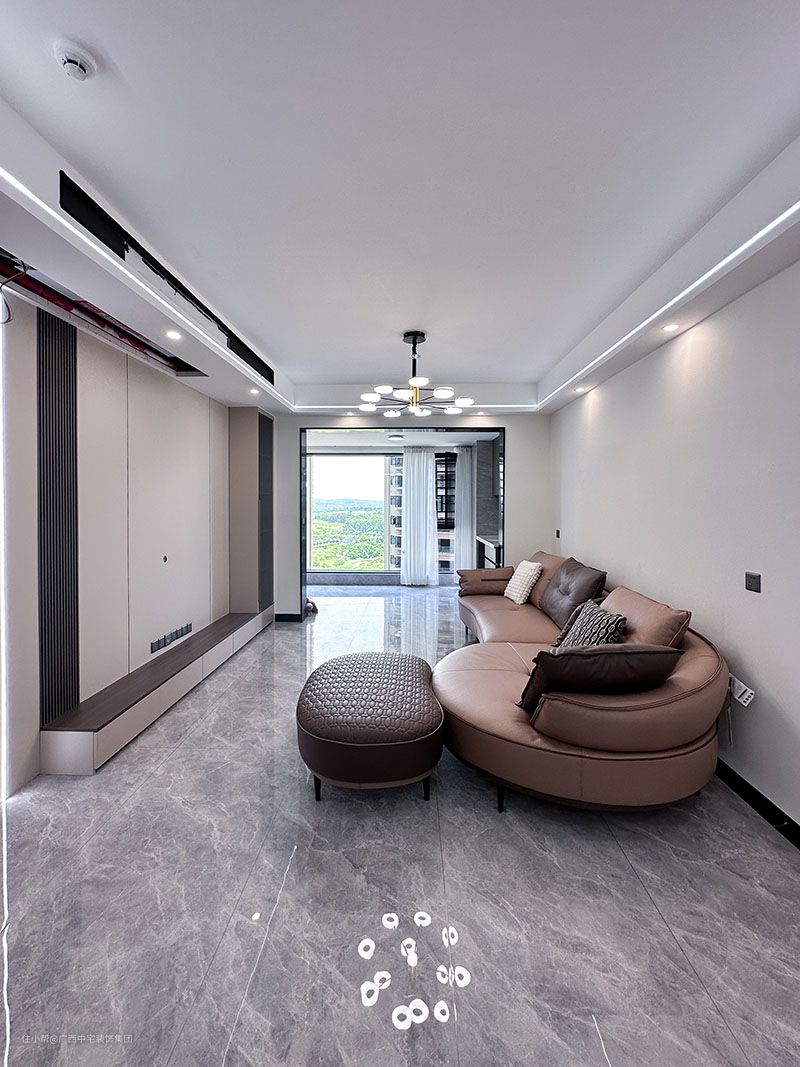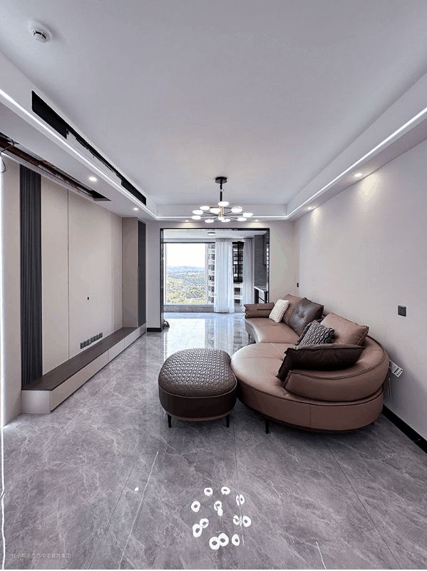 客厅设计亮点 客厅以高级灰为主调,主灯配合筒灯+软管灯带线条流畅,把空间分割更加立体化和生动化,灯光亮而不刺眼。让业主能舒心的在此看电视,再也不用担心灯光对眼睛的刺激。 皮质弧形沙发+抱枕组合,舒适的体验感,流动中的韵味,个性中不失温柔。 中性灰瓷砖地板从室内延伸至阳台,中性和典雅毫无压力的转换,调和了空间的色彩搭配。 电视背景墙的护墙板起到了美化空间的作用,避免墙面意外刮伤,起到保护的作用。 木质地台,起到装饰的作用,让电视背景墙的空间不在单调,层次感此起彼伏。格栅旁的灯带,光源的补充,增加空间的透亮。玻璃储物柜层次更丰富,彰显现代的时尚美。
