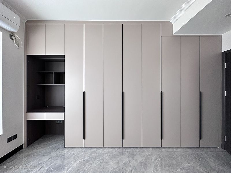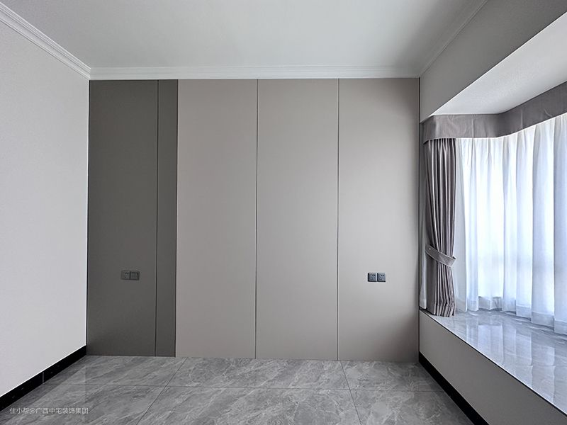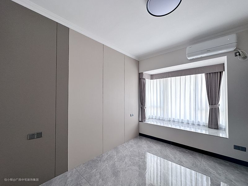 主卧以简洁、干练的空间方式生活,入门是组合式衣柜,款式比较新颖,既是衣柜又是书案,收纳和办公两不误。背景墙护墙板,墙面的保护,比较耐用,实用性高。空间采用统一色彩装饰,让空间变得更柔软、更安逸、更自然。让疲劳一天的您,能够安心的入睡。自带飘窗采光通风效果好,赏景之处,景色一饱眼福,感受诗与远方。 一圆形灯,给室内带来光照,自然细腻的光洒在地板上,纹理清晰通透,让室内有了温度。灰色的窗帘,打开窗帘,室外的风景一览无遗,提升室内亮度。