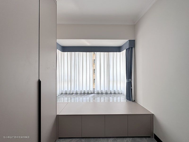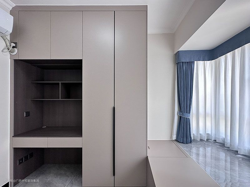 次卧浅灰色带来的高级静谧感,集储存和办公化一体的多功能柜,讲究实用性。一张桌,一张椅,静心的办公,让办公达到事半功倍的效果。榻榻米+飘窗的结合,全新的模式,是储存书籍或棉被、衣物的储存柜,储存方便。一壶茶、一张茶几,三五家人围坐一起,品茶,赏景的休闲场。 淡白色+深蓝色的窗帘,遮光性好,免受紫外线的困扰,减轻空间的压迫感,让空间变得更加舒适清透。