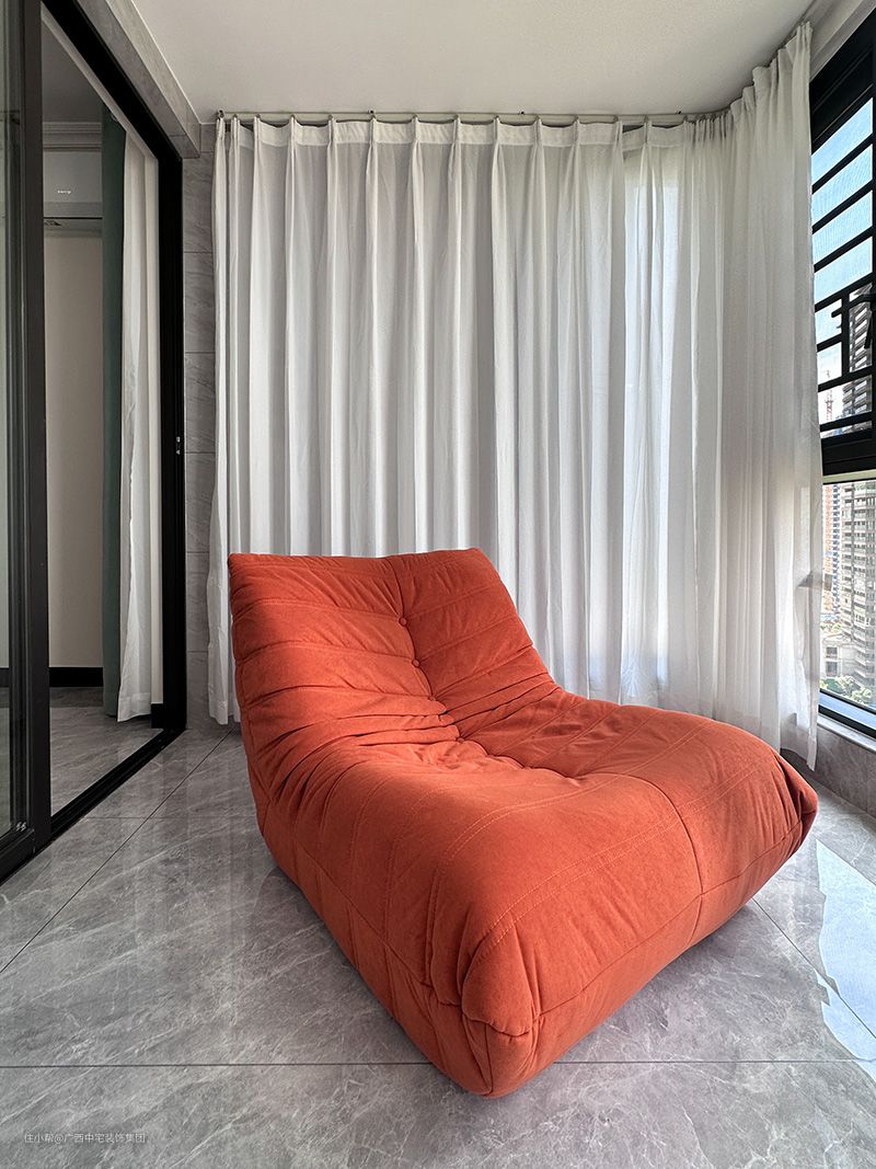 阳台设计亮点 阳台一张橙色的沙发,鲜艳的色彩,让空间热情有活力,躺在沙发上华夏院子的景色尽在眼前,在此可以赏景和日光浴,生活更惬意。窗帘遮光,阻挡紫外线,调节室内温度,给您一个清凉的空间。 阳台洗衣柜的设计,上储物,中清洗,下放置洗衣机,功能齐全。