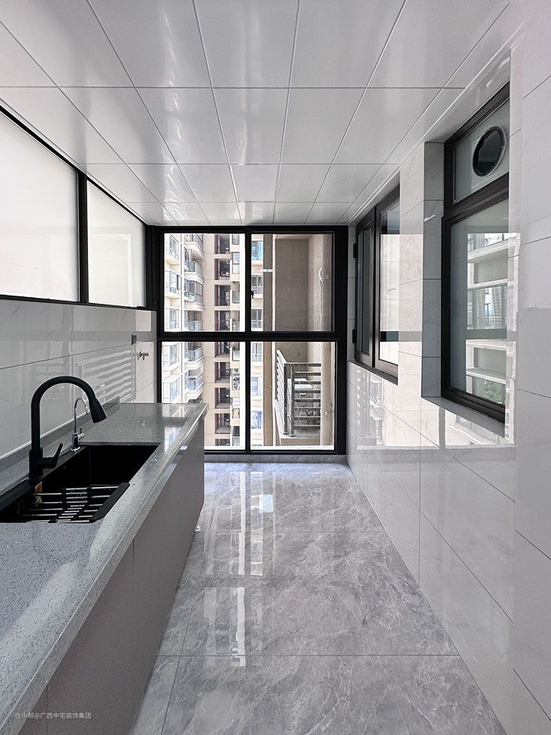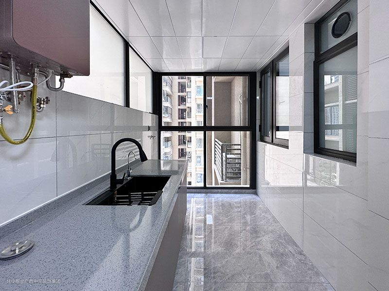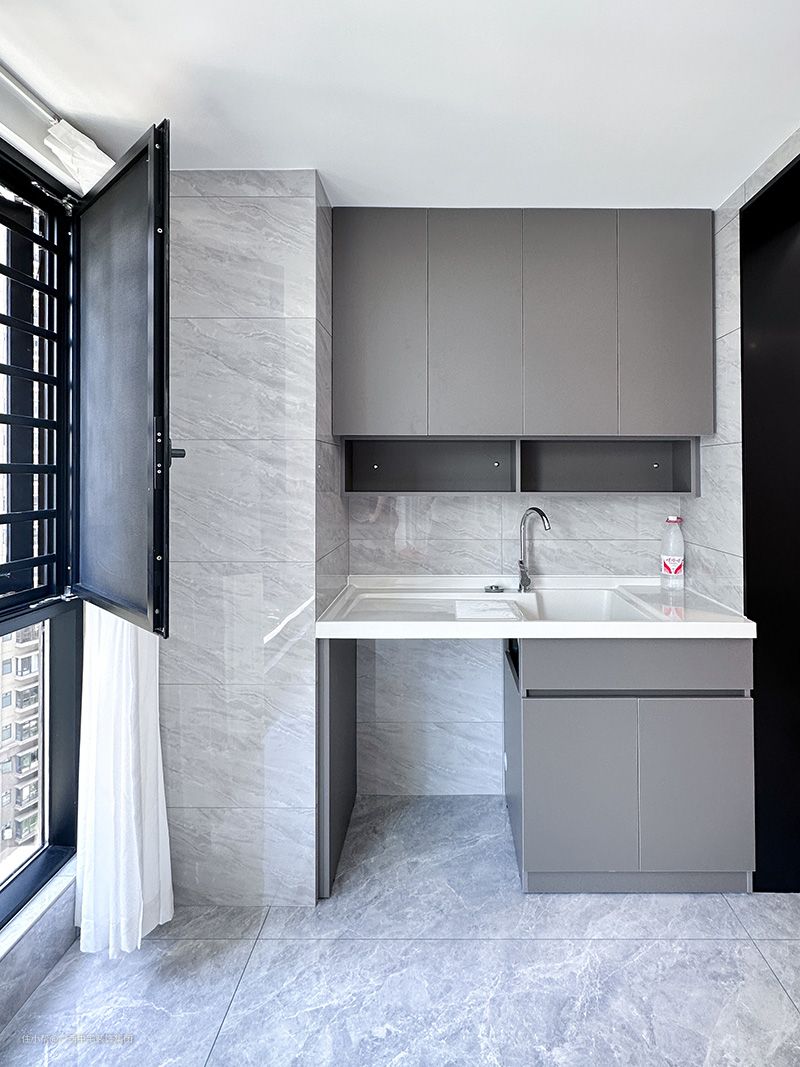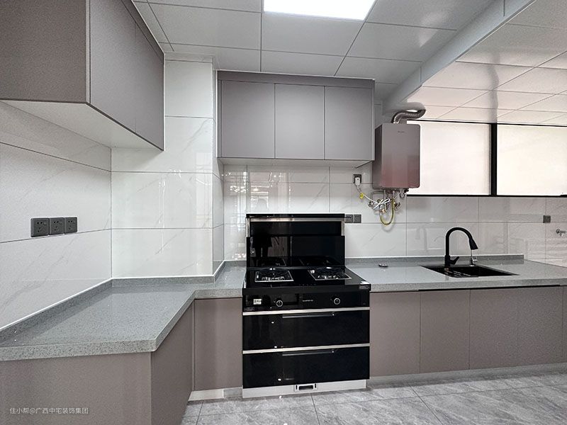 L型厨房布局灵活多变,区域划分明确,合理化的布局结构,利用率更高。墙面+吊顶都铺设白色瓷砖,空间延展性更好。考虑到业主的烹饪习惯,左烹饪,右清洗,方便操作。设计上既有现代感又不失烟火气。 上面吊柜和地柜的设计,吊柜充分利用墙壁的空间,不易积灰,好打理,储存烹饪调料,储物又不失条理。地柜全面收纳厨房用具和隐藏管道,让空间更加立体美观。