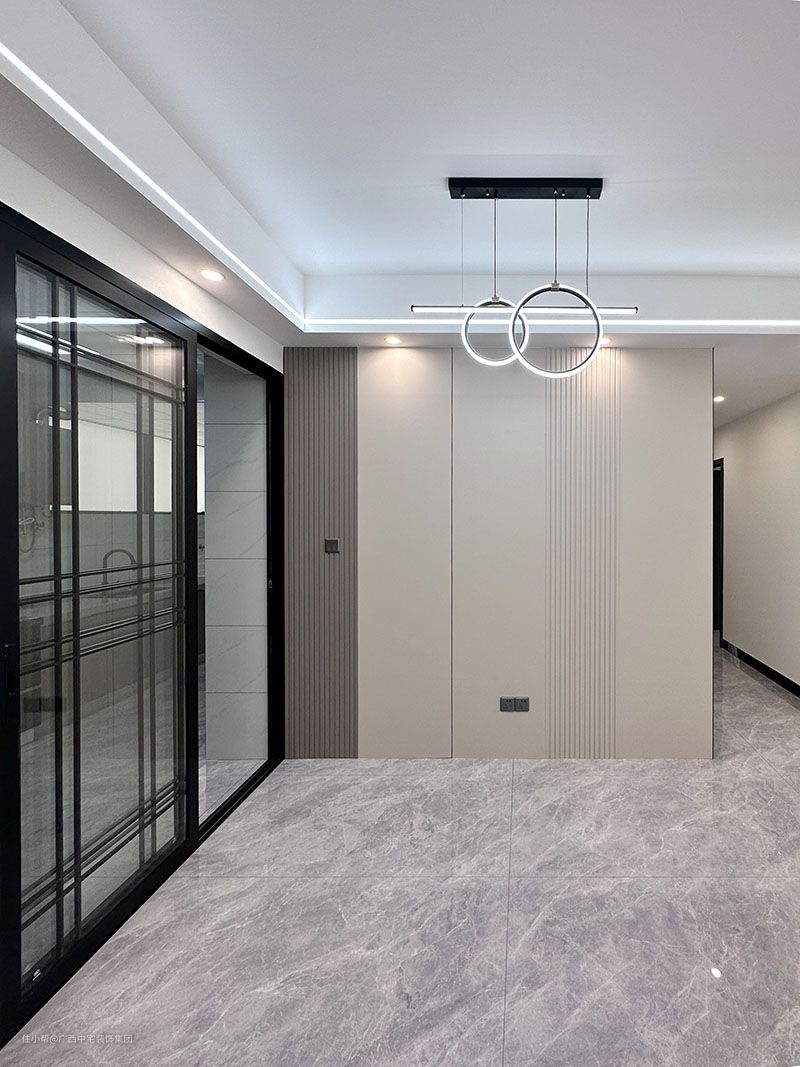 餐厅开放式的设计,纵向的延展,拉伸了整个空间的宽度。在视野上更加通透,现代化的创意吊灯,光线覆盖广,光线照在地板上,让幽暗的地板变得光亮有动感之美。 一道透明的玻璃推拉门把餐厅与厨房隔开,既能欣赏到烹饪的过程,又没有油烟的苦恼,让就餐区更加精致化。