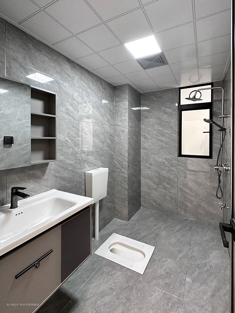 卫生间讲究的是去繁从简,极简灰色瓷砖,不但颜值高,还很耐脏。厕所蹲厕式,安装灵活,干净又卫生。 悬空洗漱台的设计,解决了打扫不干净的困扰,把水管完美的隐藏其中,美观实用的化身。由原木色点缀,打破空间的沉闷感,营造出安静优雅的氛围感。