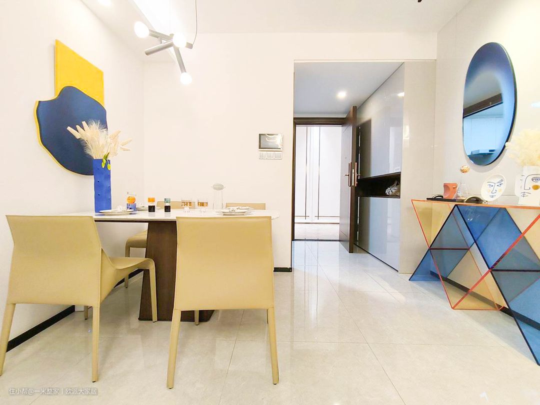 在简约风格的餐厅中,我们选择了一张大理石餐桌和四张简约的椅子,以白色为主要色调。白色灯具悬挂在餐桌上方,为整个空间带来柔和而明亮的照明效果。 挂在白色墙面上的蓝色挂饰画,是空间的亮点。蓝色亚克力餐边柜,它的透明质感和蓝色色调,与挂饰画相呼应,让整个空间更加统一和协调。餐边柜的设计简洁大方,既能满足收纳需求,又不会占用过多的空间。