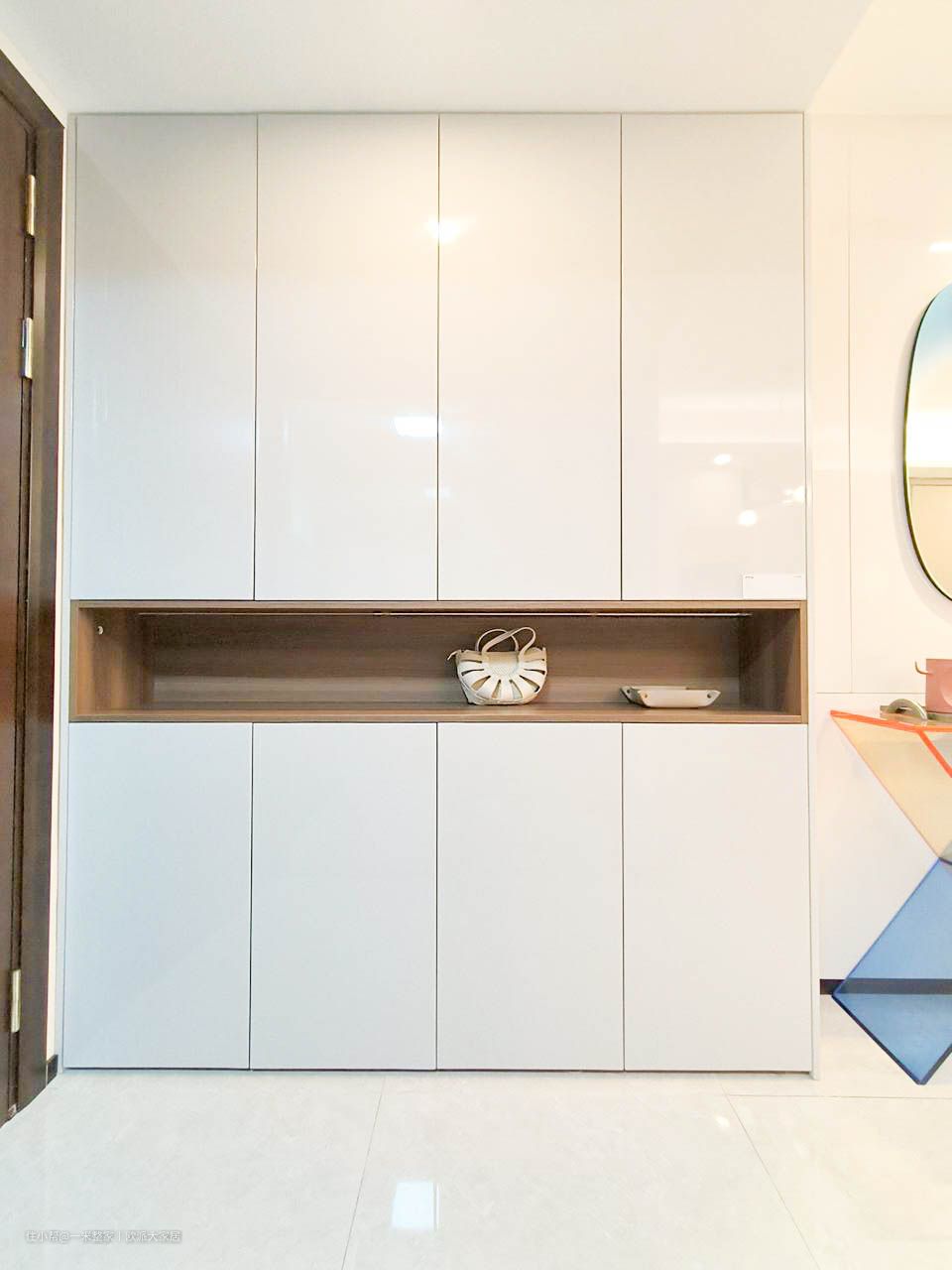 玄关位于紧邻厨房的位置,地面使用耐磨的瓷砖易于清洁和维护。白色亮面玄关柜上下储物收纳更实用,置物区内壁采用木质内壁形成对比,温馨感十足。