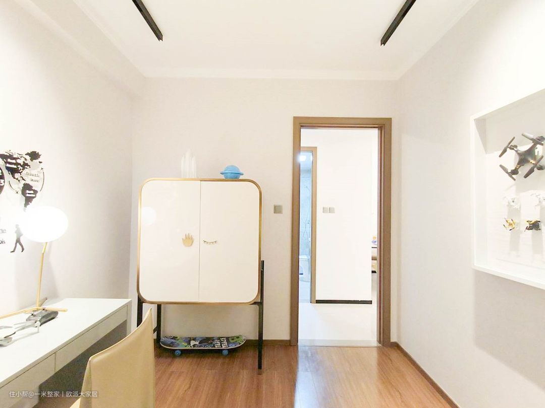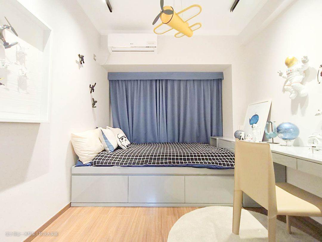 次卧采用榻榻米风格,为空间带来温馨而舒适的氛围。榻榻米床以其低矮的设计和柔软的垫子,提供了一个舒适的休息和睡眠空间。墙上摆放着宇航员模型和摆件,营造出充满想象力和探索精神的氛围。此外,墙面上还有等式飞机形状的装饰,展现出飞翔的动感和创造力。 床尾柜与书桌巧妙地拼接在一起。这种设计不仅可以让你在卧室中获得一个舒适的工作区,还能节省空间和提高整个房间的美感。