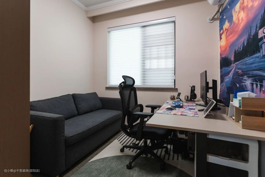 电竞房整体上偏冷色调,黑色沙发沿墙摆放,书桌椅立于前方,多色拼接的地毯点缀,给冷硬的空间添一抹柔和,氛围干净舒适。