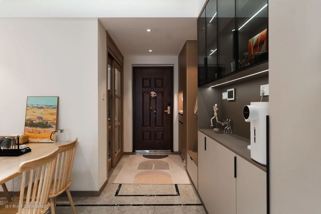 玄关,多种色彩与材质组合,令空间呈现出一种丰富多彩的状态。灰色瓷砖并勾勒出几何形状来,搭配顶面筒灯照明,安静又温柔。