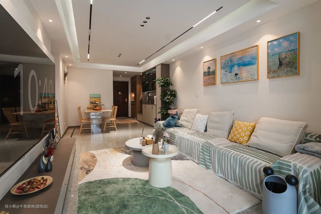 客餐厅一体的开放式格局,以全新的悬浮吊顶+无主灯照明,将两大空间串联起来,抒写通透的同时,也构筑了整体悠闲惬意的意境。将原有的大白墙,重刷可可蛋奶色乳胶漆,并搭配莫兰迪色系的软装,以温柔的色彩诠释家的治愈纯粹,打造柔和的奶油格调。