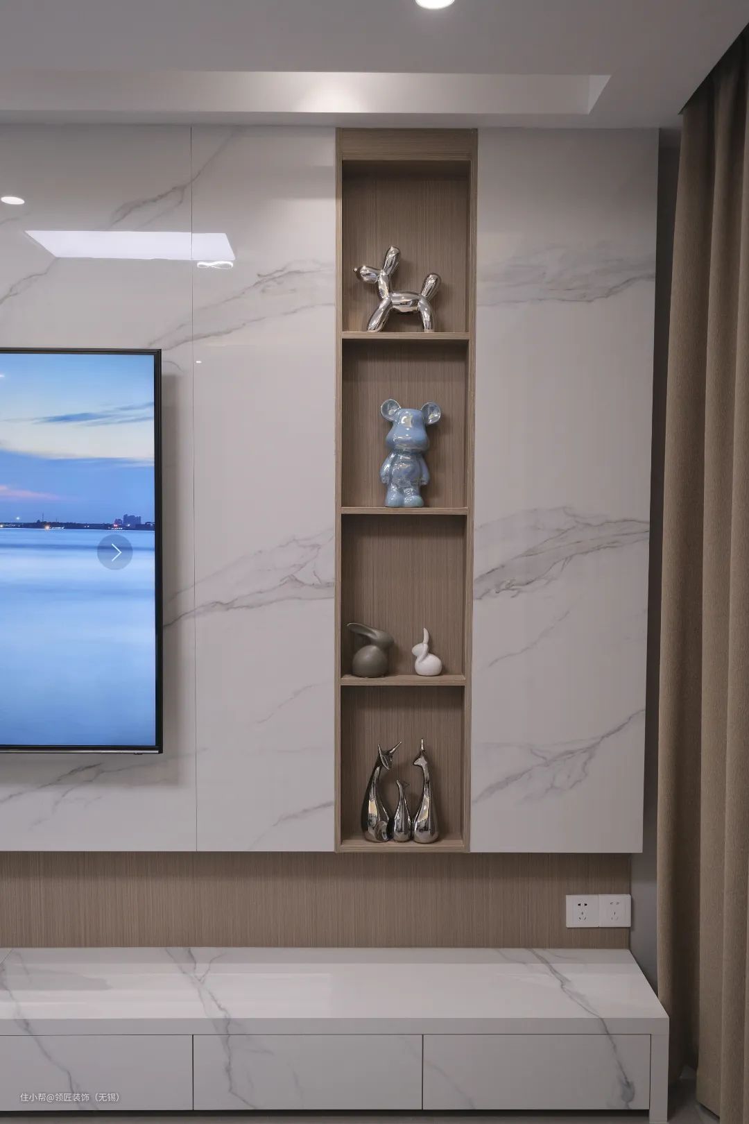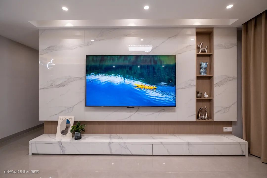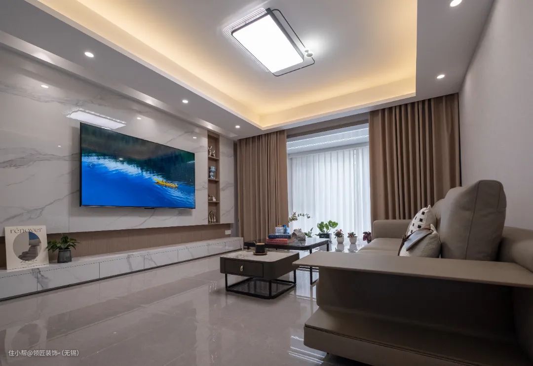 客厅整体采用浅灰+白色+浅咖的色调,浅色系的运用让空间更加温馨。电视背景是经典的岩板造型,并加入展示柜设计,线条简约流畅,现代感十足。到底的一字型电视柜,把收纳功能拉满,台面上还能摆放装饰物品,美观与实用并存。