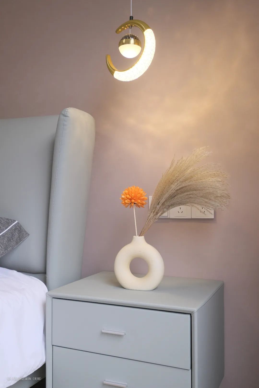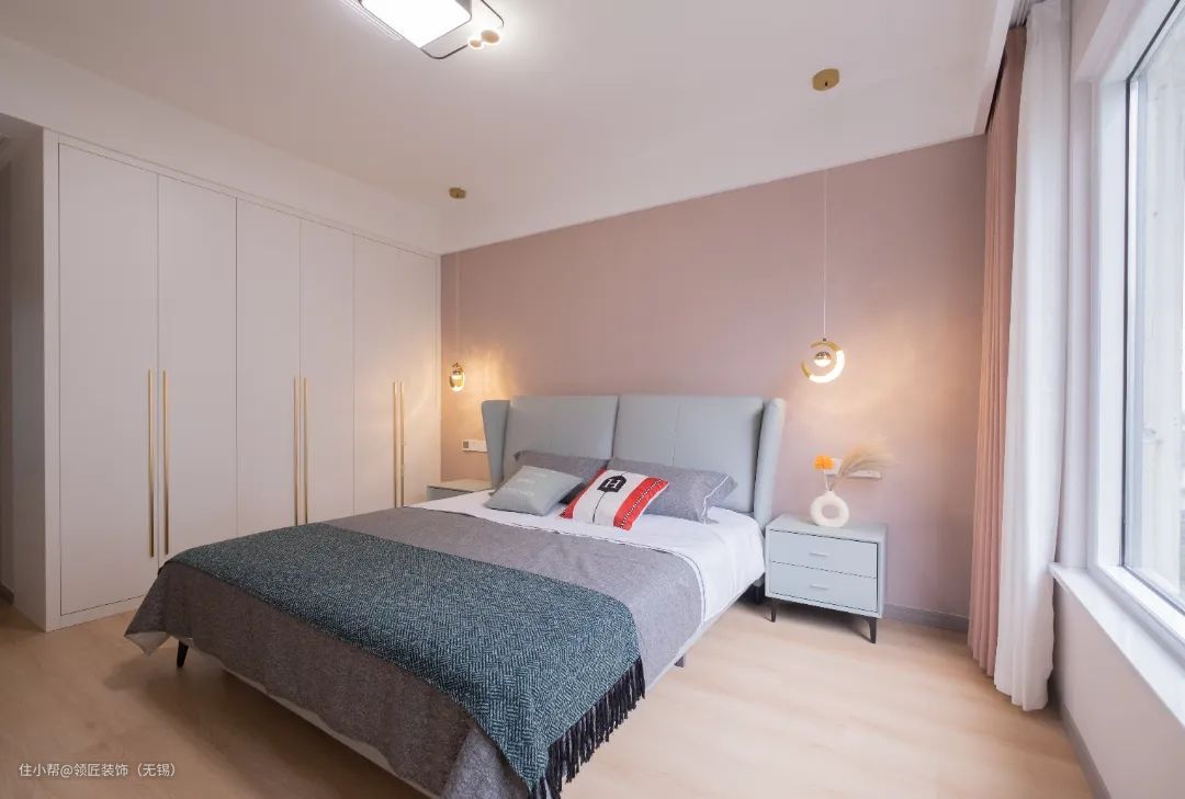主卧和次卧都是非常温暖的色调,原木地板增加室内温馨氛围,浅粉色墙布,搭配淡蓝色靠背、床头柜,使得卧室空间安静舒适而优雅大气。