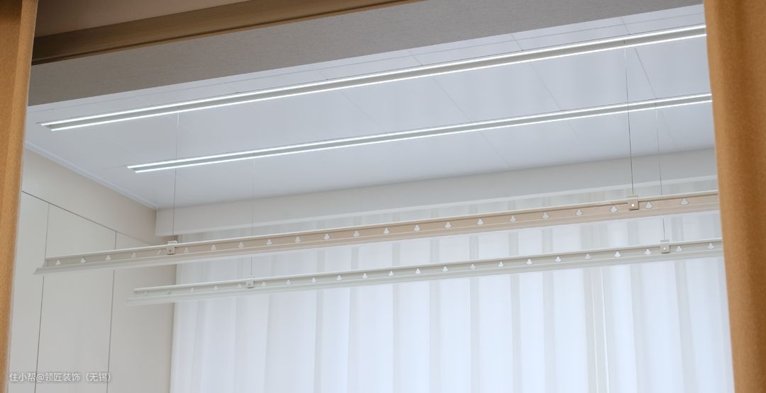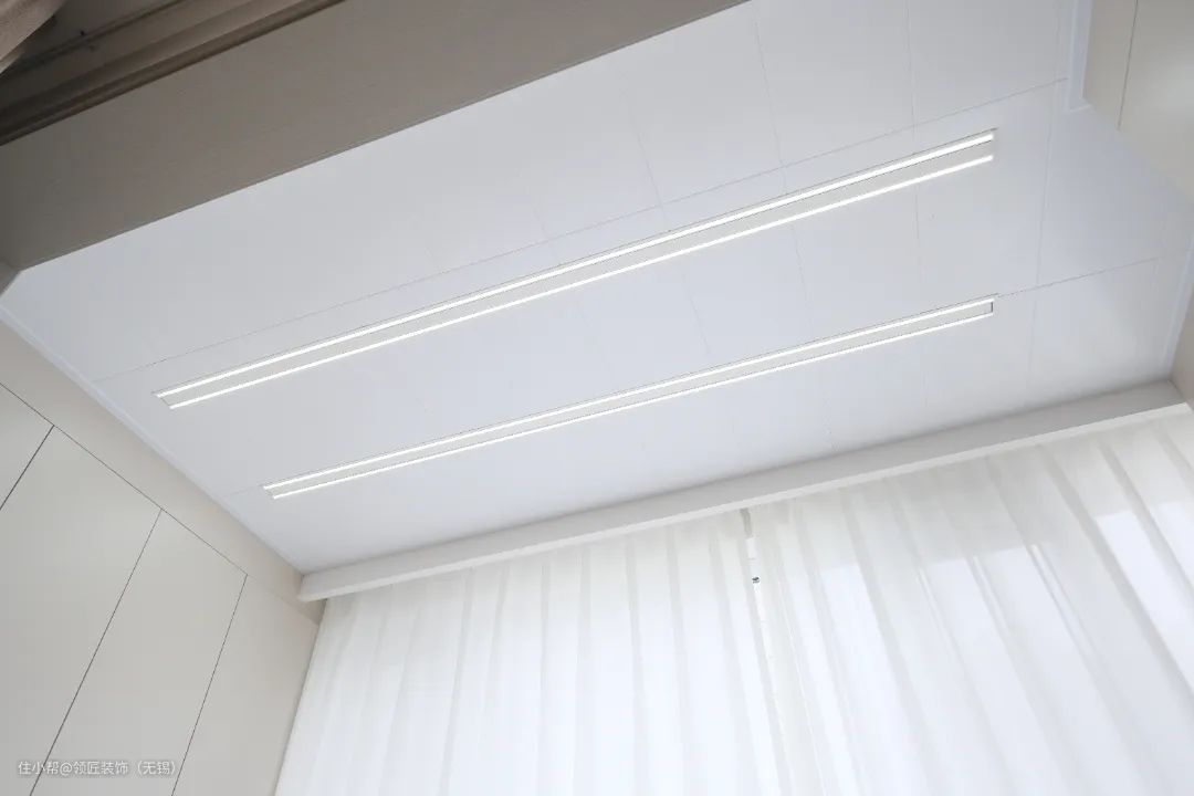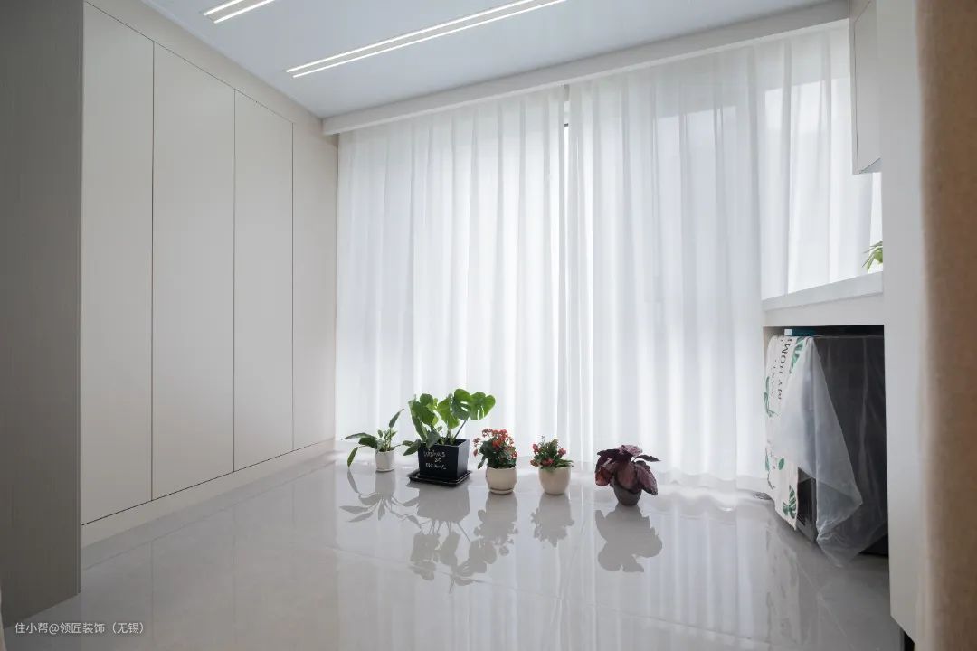 阳台和客厅打通,用大面积地砖通铺,加上落地窗的设计,显得空间更大、更加通透。阳台两边一面做了到顶的收纳柜,一面设置成洗衣区。自带灯带的电动窗帘,更是颜值爆棚。