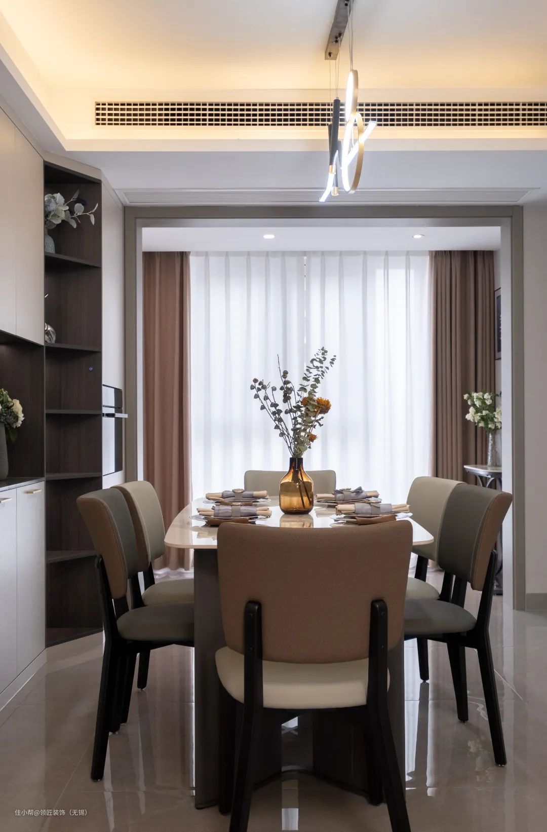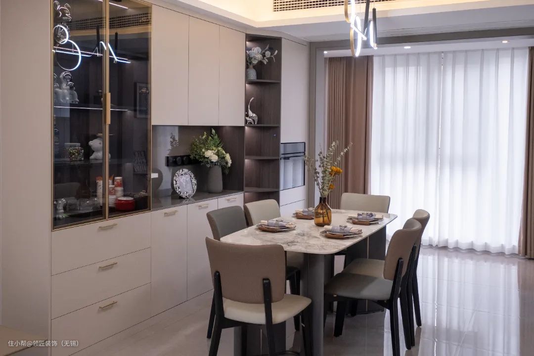 餐厅区域非常精致,南北通透的户型保证充足的采光。六人位的餐桌可以满足一家人的用餐所需。一整排的收纳柜,加入开放格设计,摆上喜欢的装饰,提升整个餐厅空间的仪式感。