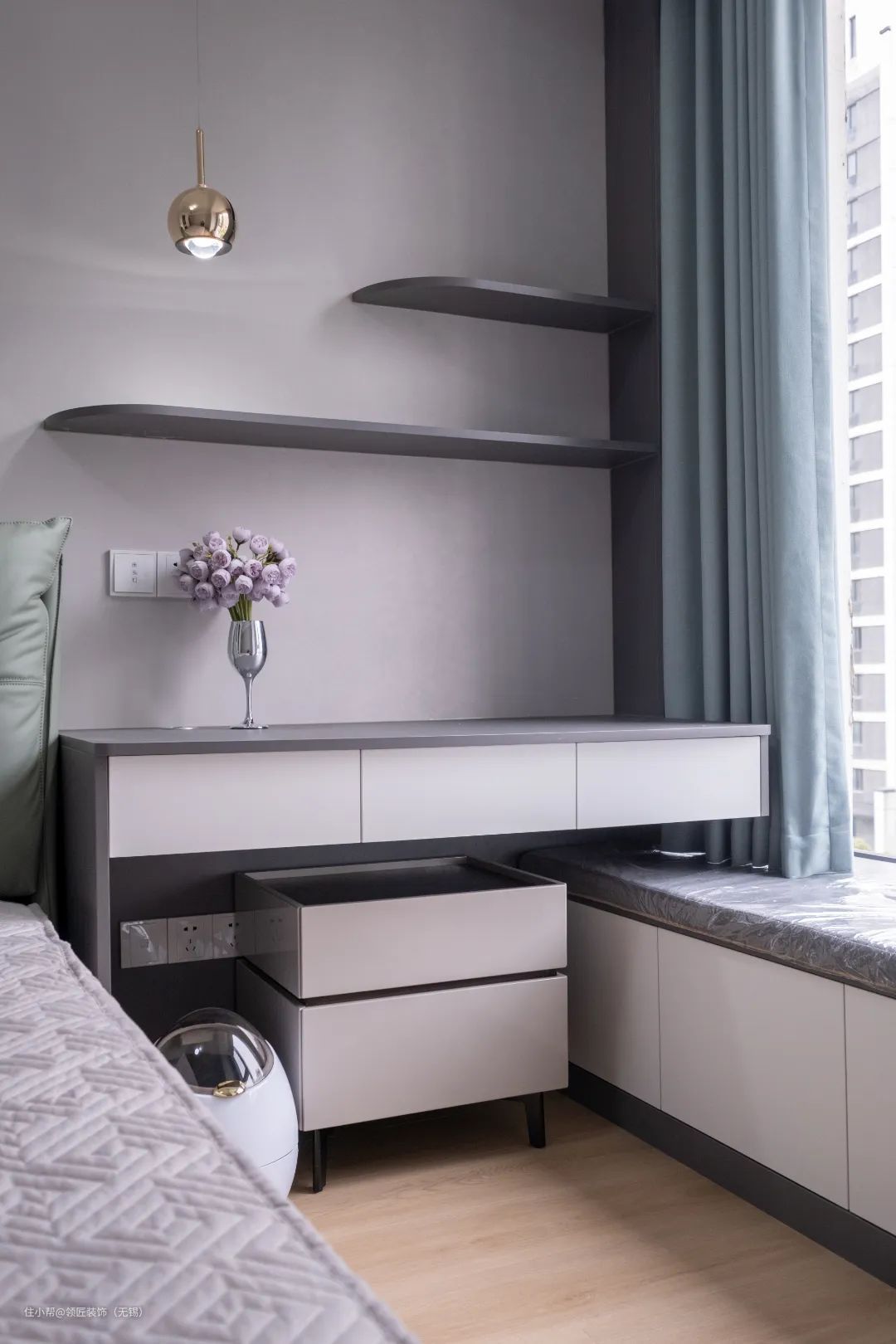 次卧飘窗设计了可收纳的空间,可以放置一些换季衣物,飘窗书桌一体,合理利用空间。