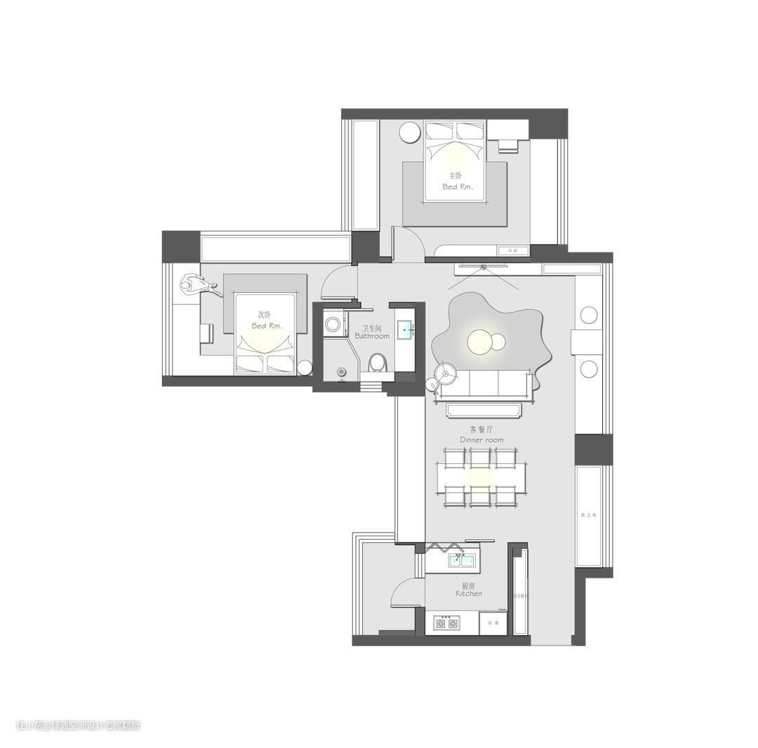 半开放式厨房和客餐厅有互动感,与客餐厅隔而不断,扩大门洞的同时也给家人之间的互动交流提高便捷度。