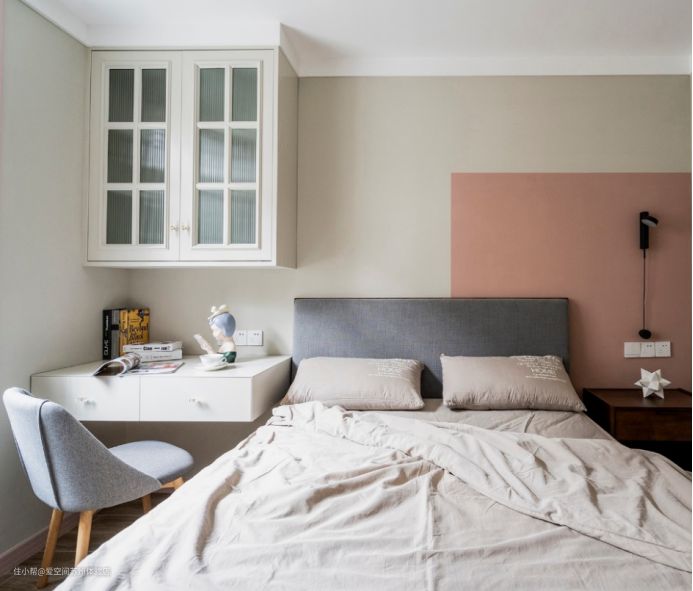 主卧并没有大面积漆刷粉色避免落俗。粉色的色块既避免了大面积单色的单调又与其他区域相呼应,让风格更加统一。 一侧的顶天立地柜提供了充足的收纳空间,让房间更易保持洁净。另一侧是一个简易的书桌,平常办公学习也非常合适。