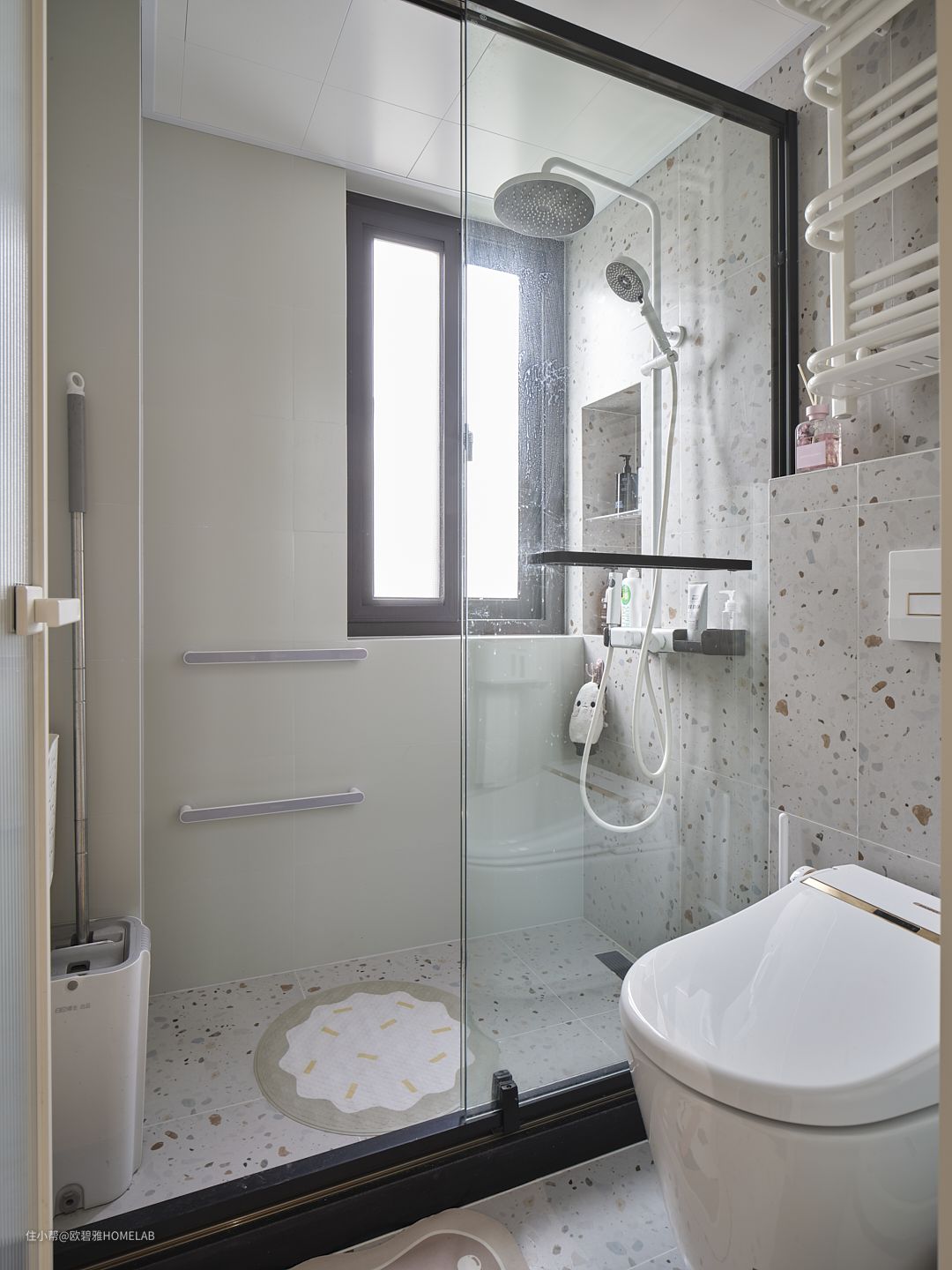 利用和厨房之间的墙体,做了入墙式马桶;释放湿区的视觉空间。淋浴区壁龛设计也可以满足卫生间的储物需求提升空间的利用率~ #卫生间#洗手台外移#台盆#储物#现代#亲子设计
