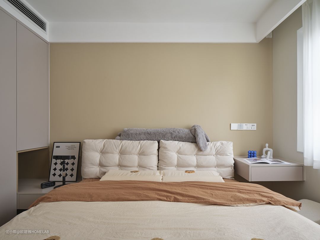 卧室改造:主卧门洞改变方向,做隐形门,增加储物同时改变原先客厅开口多的问题,也可以增加电视背景墙的完整性。两边床头柜都做了悬浮设计,释放卧室空间体积感。 #卧室#置物柜#储物#现代#亲子设计