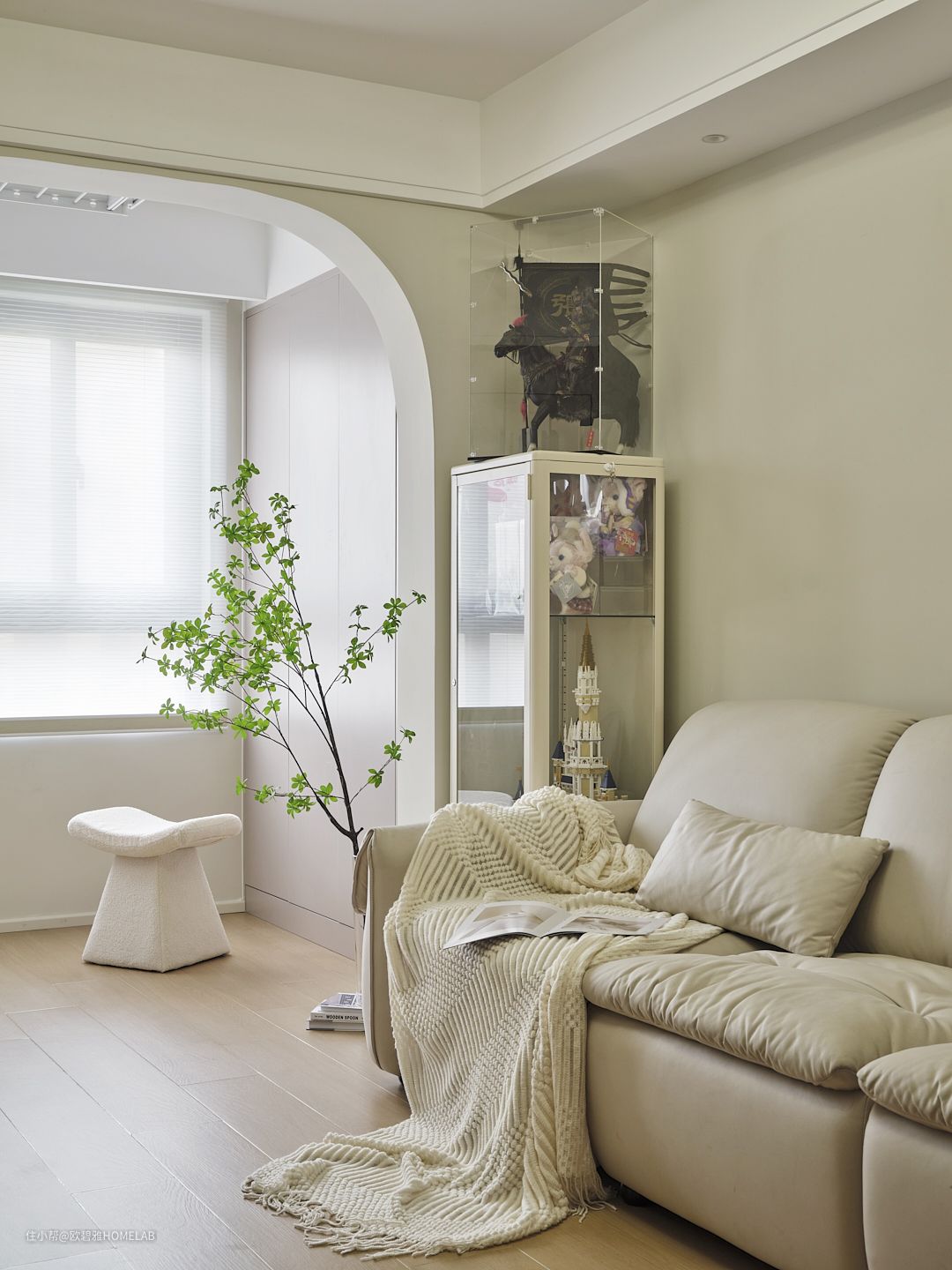沙发一角也置放了透明展示柜可以满足业主需求,阳台跟客厅无遮挡空间整体的采光也有了基础保障。 #客厅#电视背景墙#沙发#电视柜#现代#亲子设计