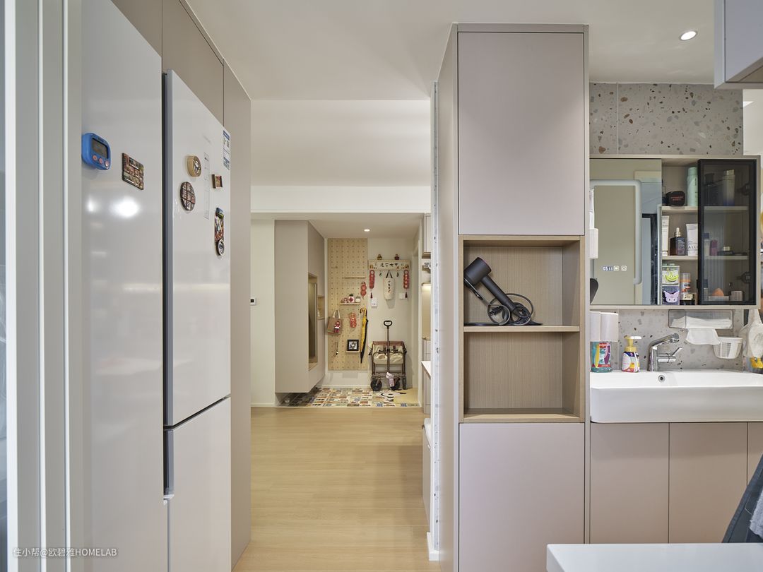 【洄游动线】餐厅连接卫生间做“洄游动线”外移干区的设计可以错峰使用,不耽误早起上班上学的进程。同时可以借助外移台盆的空间做定制柜体提升空间利用率和收纳面积。 #卫生间#洗手台外移#台盆#储物#现代#亲子设计