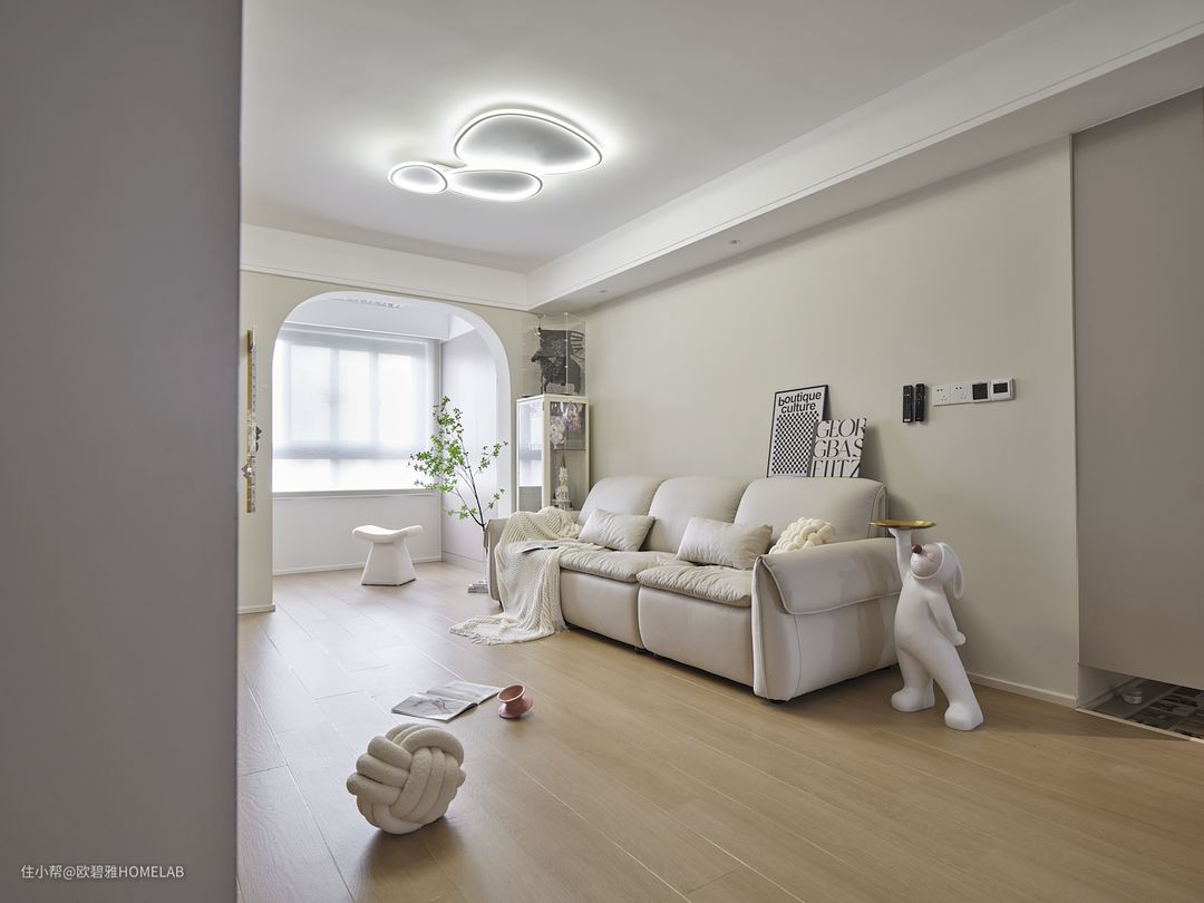 装修过程花了多长时间? 3个月 说说是什么给了你灵感,打造出现在这个作品的? 房屋设计重点围绕【三房改两房】【全屋收纳&展示】【开放式儿童房】【洄游动线】通过优化布局动线来提升空间的趣味性~ 你对这套作品最满意的地方在哪里,为什么? 满意,居住舒适度达到的同时也满足了业主所说的功能最大化 对平面布局做了哪些优化改动,为什么? 【敲墙&新砌墙】提高空间视觉完整度,减少单个区域视觉分散,增加“块面空间”放大空间感,在光线和布局的基础上改变原始户型面积局限 【洄游动线】餐厅连接卫生间做“洄游动线”一边做餐厅卡座,一边干区外移,小朋友吃饭洗手方便。提高空间趣味性、交互性。 【主卧门洞改方向】做隐形门增加储物减少客厅开口多的问题。 为了满足客户的个性化需求,你在设计过程中做了哪些事情? 【项目需求】 1.一间多功能儿童房(集:儿童房、次卧、办公、小影音室) 2.改变动线提升空间趣味性 3.改变客厅开口多问题 4.提升全屋收纳&展示空间 以上4点都完美解决了!!!