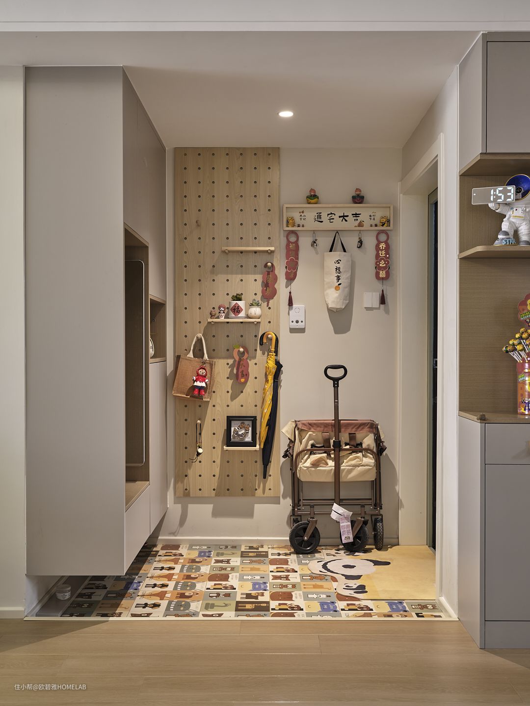 对于小户型来讲洞洞板的储物增持是很有必要的,可以提高空间整洁度,同时也可以实现无尘入户~ #玄关#悬浮玄关#下沉式玄关#现代#亲子设计