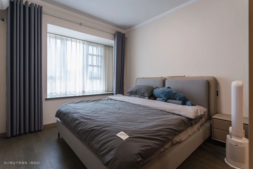主卧,奶咖色背景墙,结合深色木地板,辅以灰蓝色床品,丰富色彩层次感。飘窗一隅,引入充足光线,勾勒出随性舒适的适眠环境。 灰蓝色软包床头+同色系床品,搭配简约留白的背景墙,搭建一方悠闲惬意的居所。原木色衣柜,一门到顶,充分满足屋主的收纳需求。