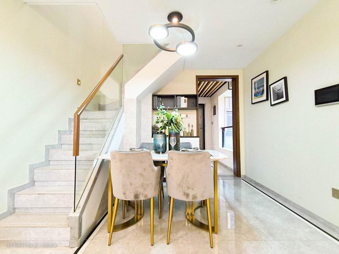 将复式楼梯转角的空余空间利用起来,巧妙嵌入橱柜与吊柜,构建出一个功能齐全的饭厅操作台。墙面上精心布局的插座,使得一些小型电器或享受火锅的乐趣不再受制于电源的限制。餐桌与餐椅皆采用优雅的细脚设计,搭配毛绒灰色的布艺餐椅,显得更为清爽舒适。
