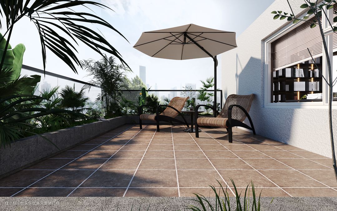 露台处的风景最不能错过,仿古砖,镂空竹椅、茂盛的叶,质朴的伞,清风徐徐邀我去。