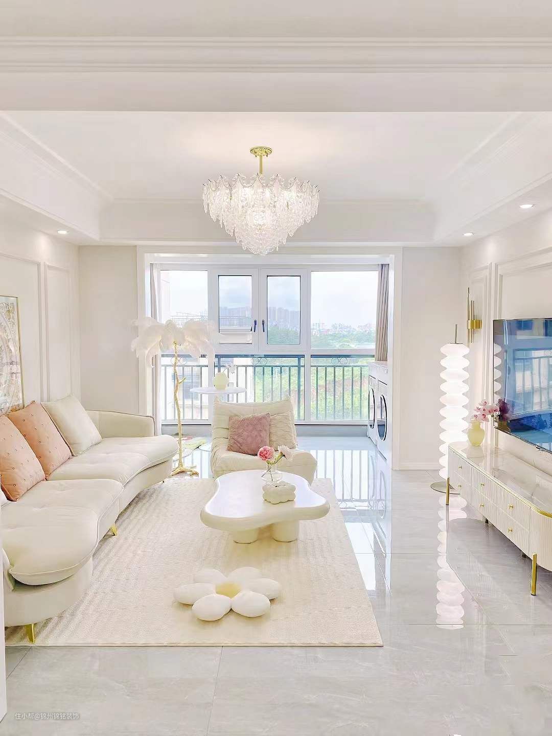 电视背景墙用石膏线做造型, 4公分的石膏线,看起来简单大方,性价比真的很高!双眼皮吊顶, 安装了风管机,客厅走了双眼皮边吊,下吊25公分,上方贴8公分石膏线,简单大气也不压层高。灰色亮面砖 视觉上整个延伸性更好更显大!阳台封窗把客厅阳台包进客厅,窗户定制内白外灰,白色更显通透显大。
