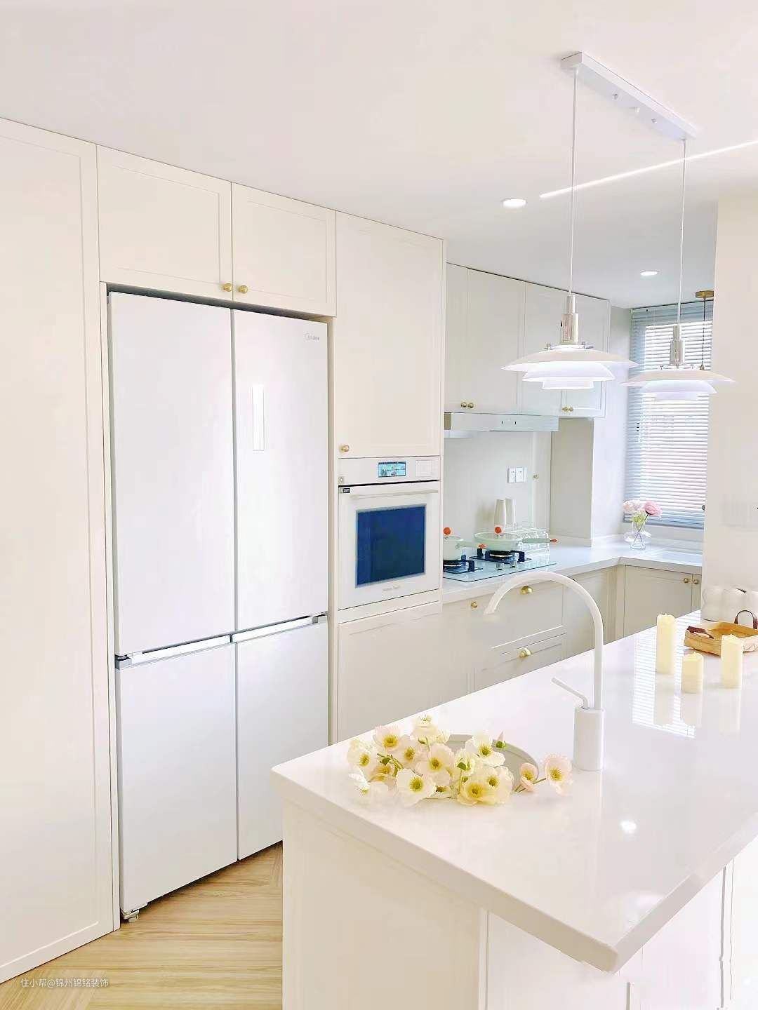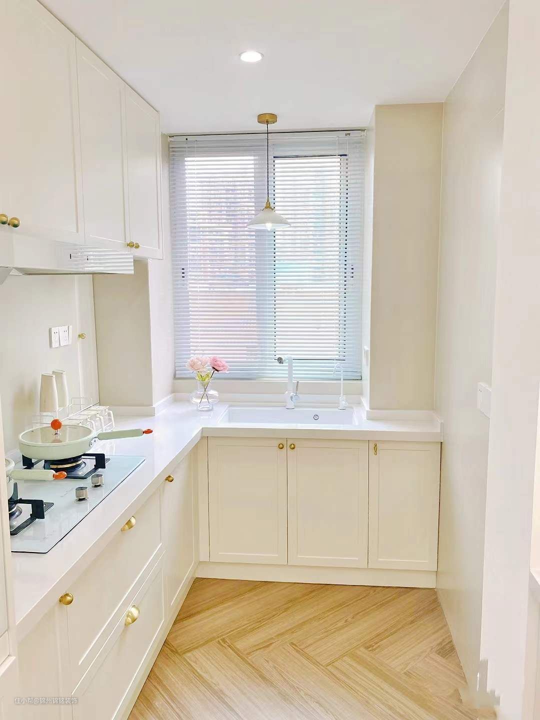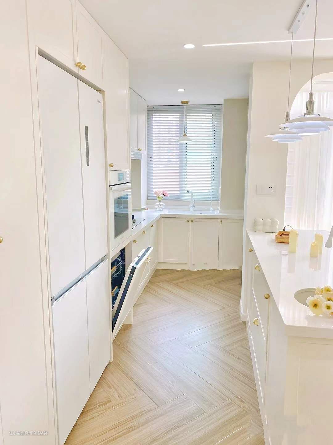 地面选择了 木纹砖人字拼通铺, 奶油白瓷砖上墙,柜门和踢脚线定制了同色,阳光下就是纯正的奶油白。纯白色的石英石水槽、大单槽配上抽拉水龙头,日常清洗真的很方便,岛台还搭配了两个简约的飞碟吊灯,开灯后很有氛围感。