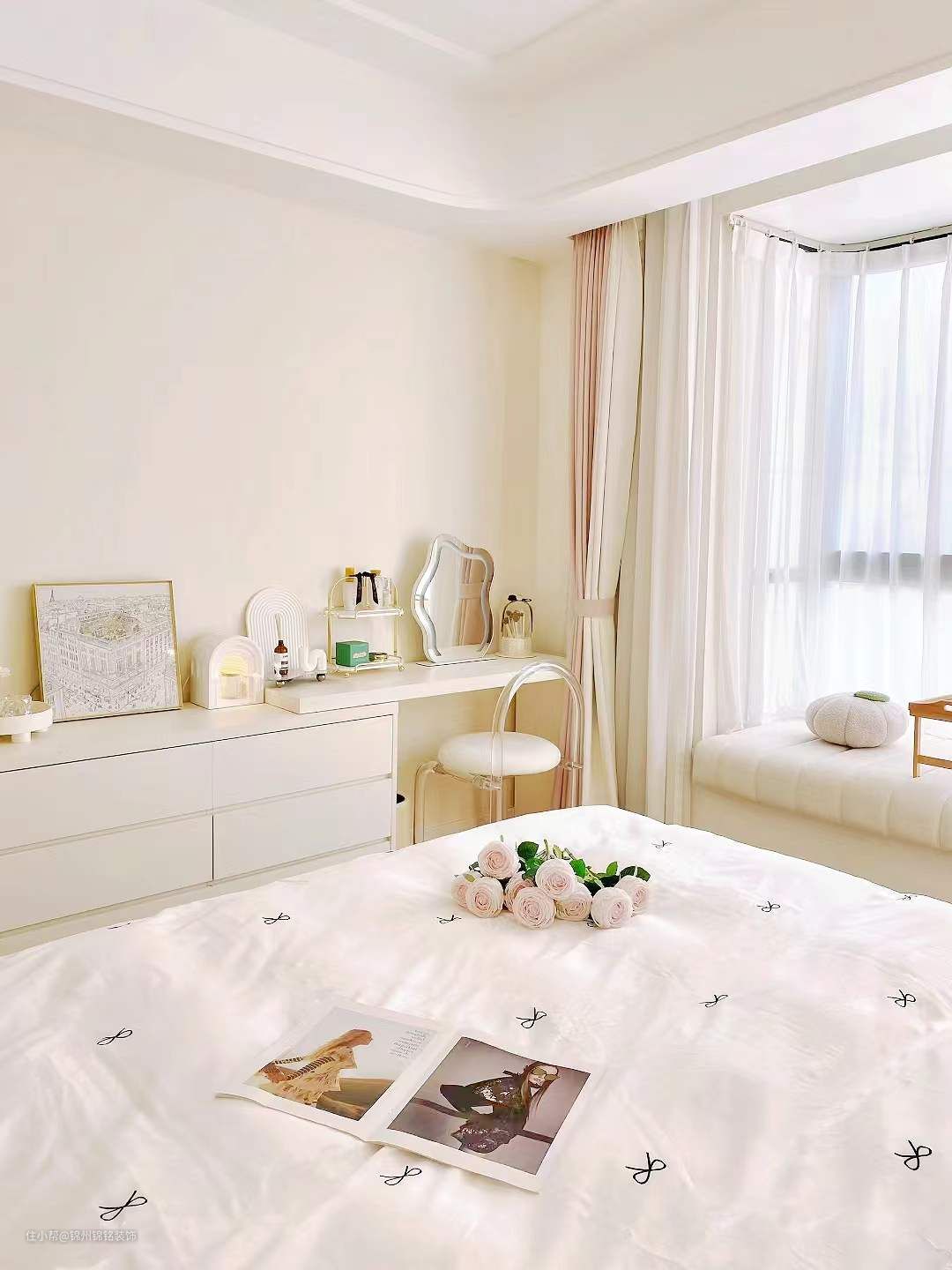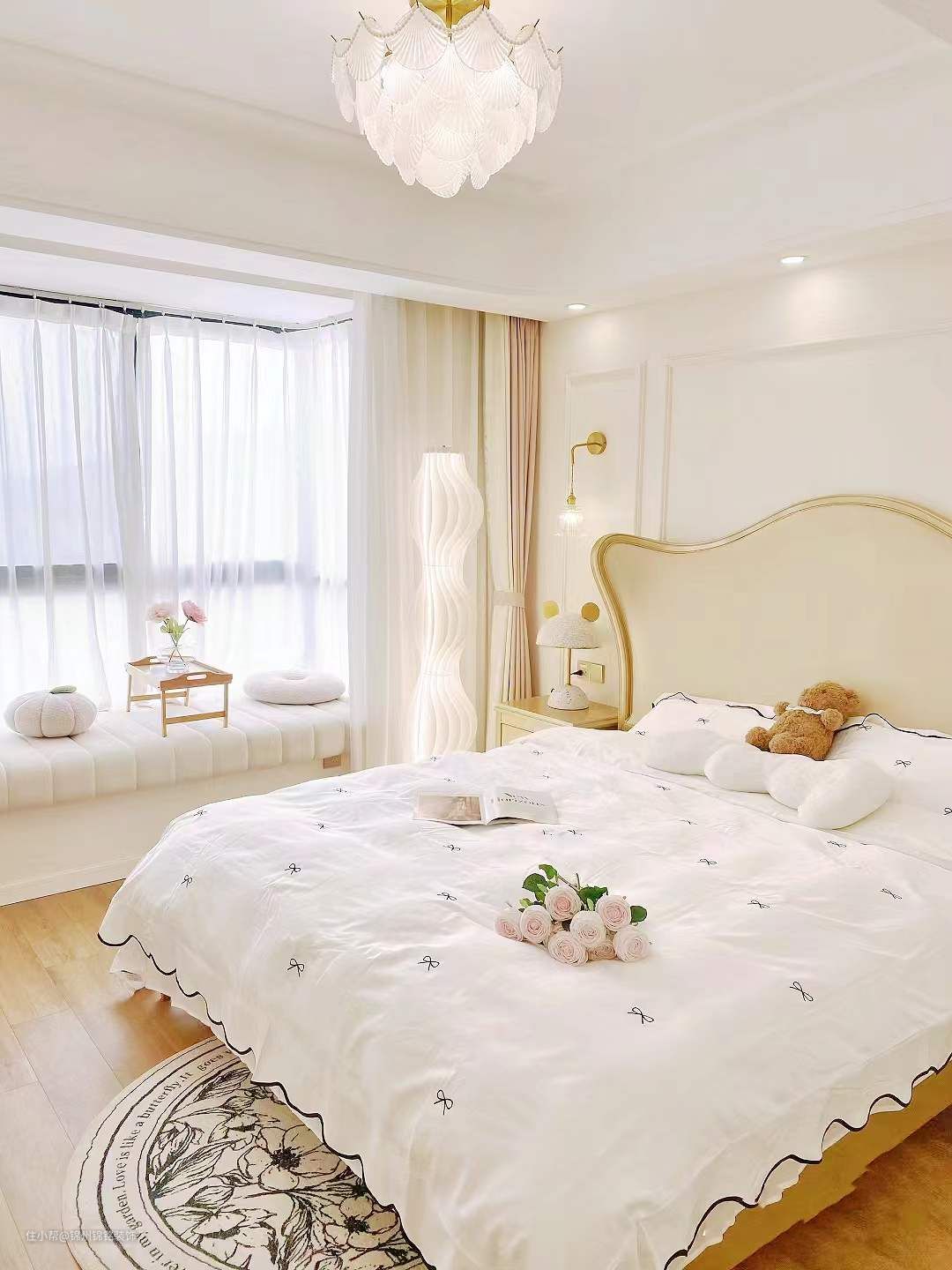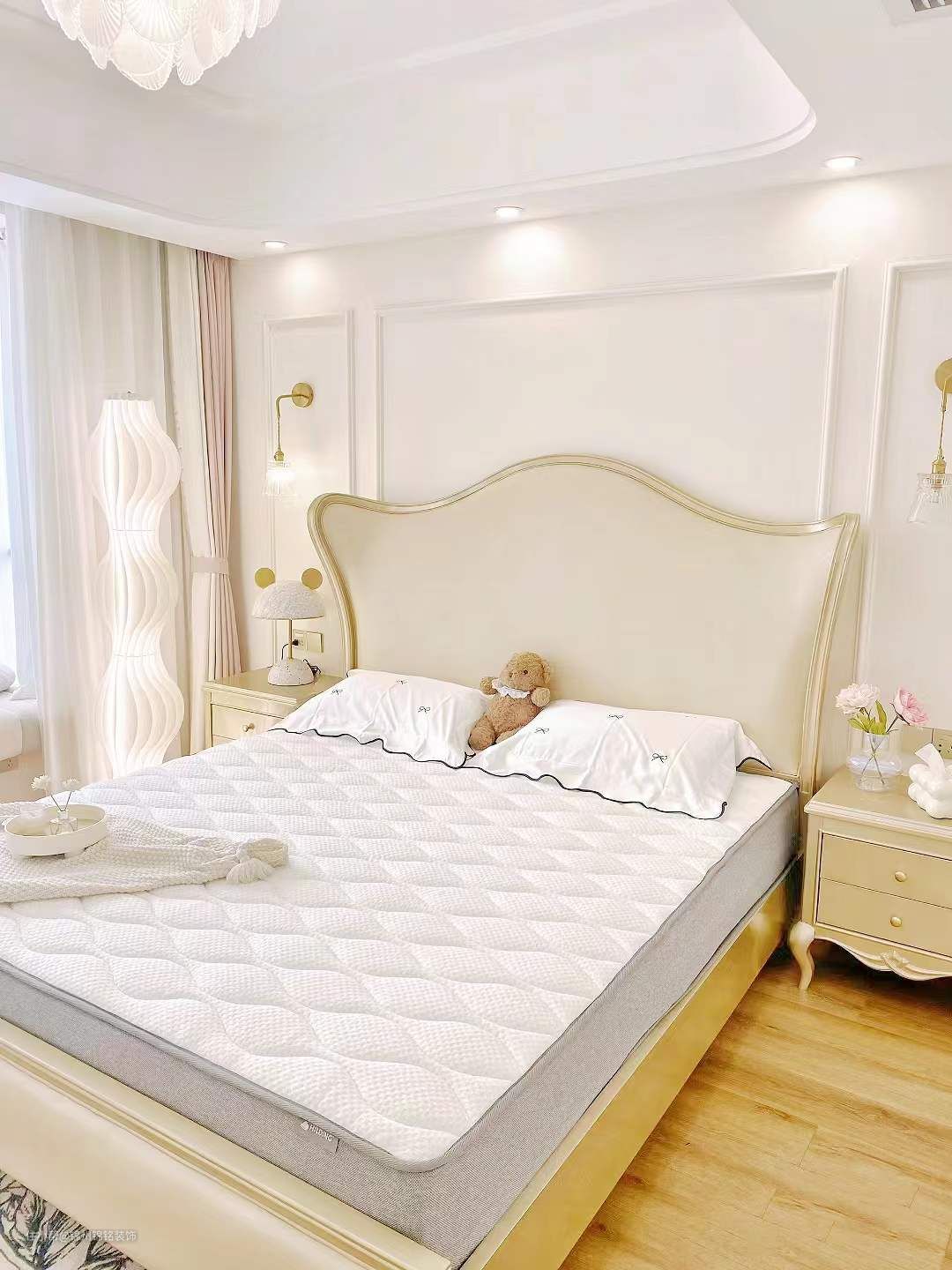 通刷可可蛋奶,肉眼看过去就是淡淡的奶油色,很耐看,床头背用石膏线做了简单的造型,选择了弧形吊顶, 地板选择了传统的三六九拼,既耐看又不费材料,也不容易过时!