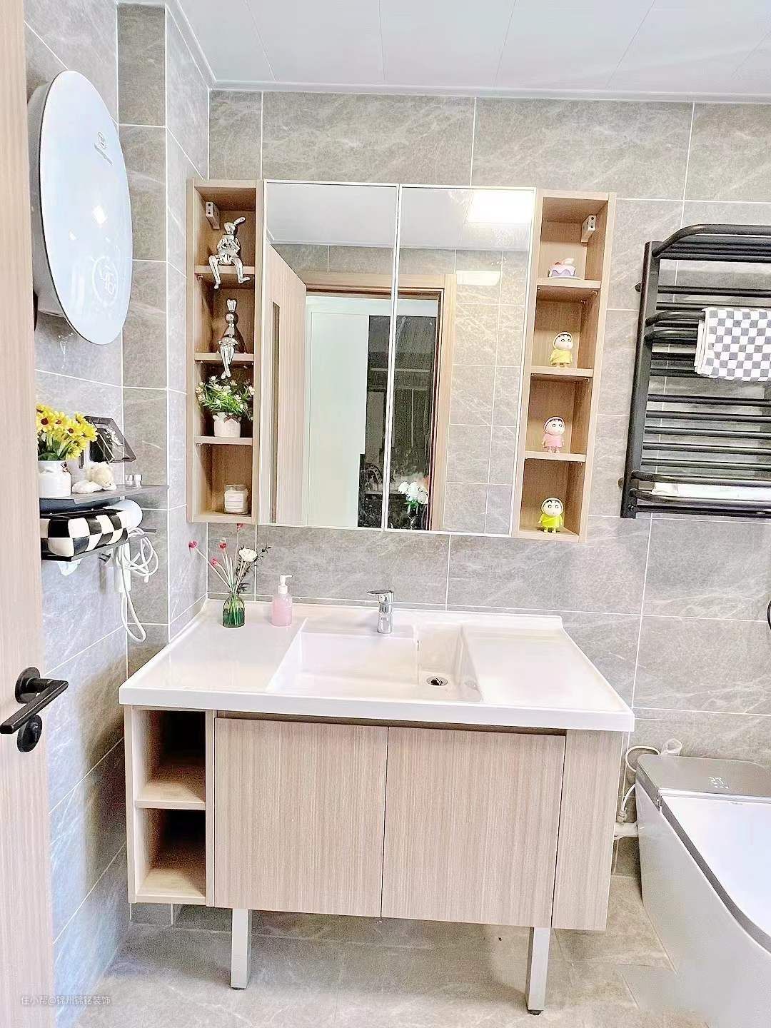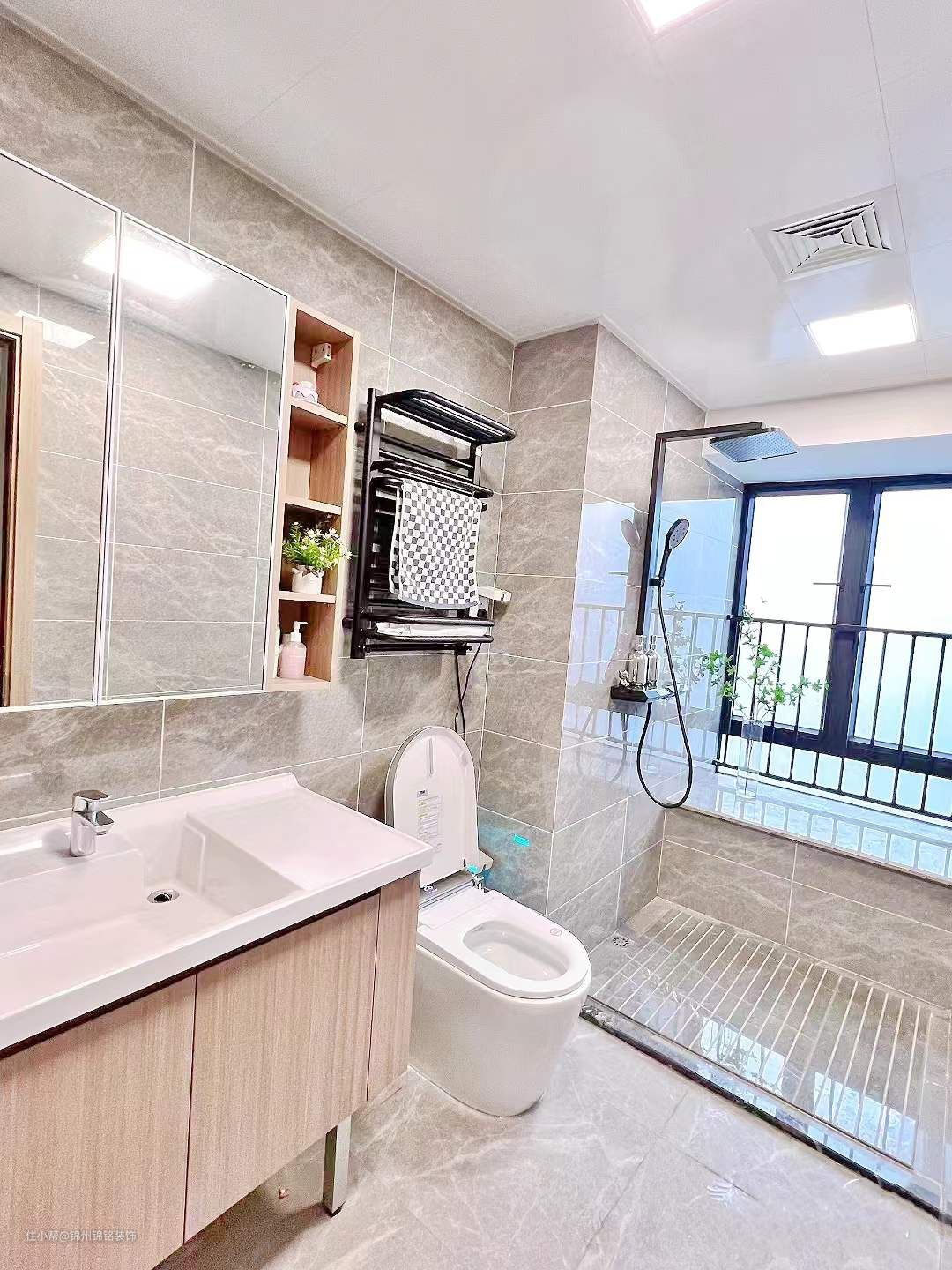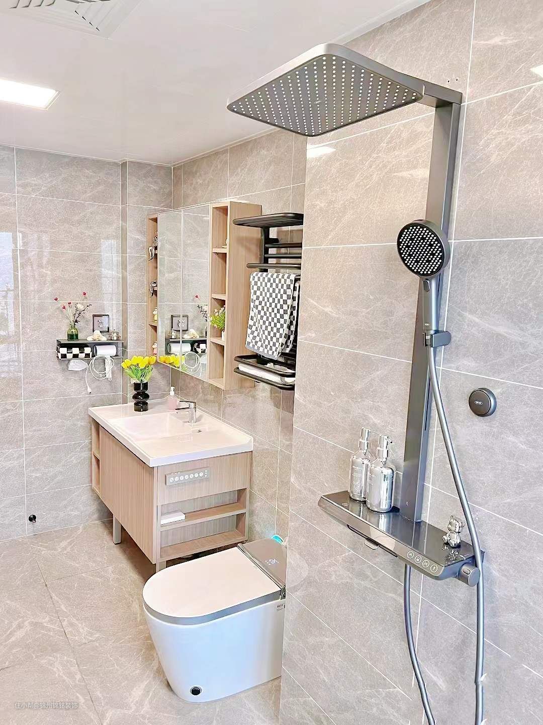 卫生间是由洗漱区+马桶区+淋浴区组成。关于吊顶,吊顶是白色铝扣板,墙砖尺寸是30*60,灰色亮面瓷砖,瓷砖贴到顶!。地砖尺寸60*60,灰色哑光防滑砖。
