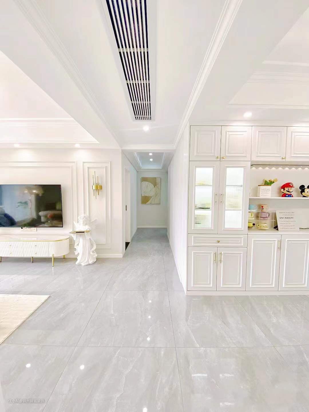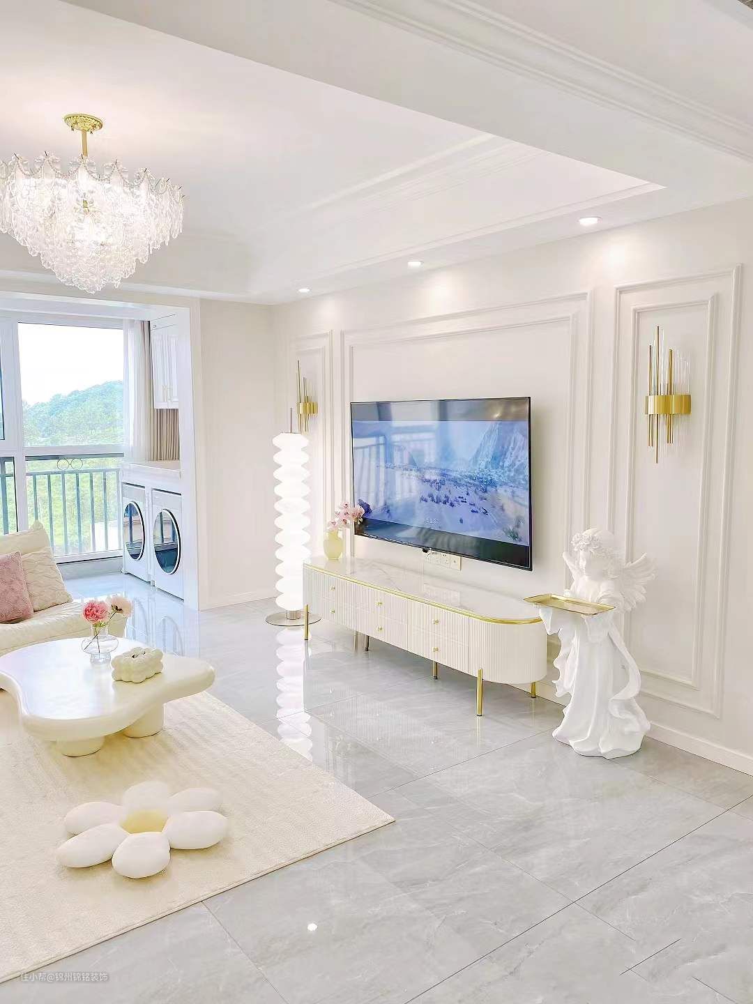 电视背景墙用石膏线做造型, 4公分的石膏线,看起来简单大方,性价比真的很高!双眼皮吊顶, 安装了风管机,客厅走了双眼皮边吊,下吊25公分,上方贴8公分石膏线,简单大气也不压层高。灰色亮面砖 视觉上整个延伸性更好更显大!阳台封窗把客厅阳台包进客厅,窗户定制内白外灰,白色更显通透显大。