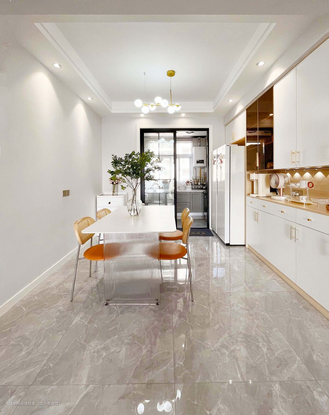 客餐一体设计,通透敞亮。 餐桌上方6头魔豆灯,多种灯光模式可调,满足不同氛围需求。 靠墙定制了满墙餐边柜,左侧嵌入双开门大冰箱,位置合理。 中间双开玻璃门吊柜可做酒柜,储藏物品一目了然,查找方便。 开放格提前预留点电位,可以放置一些日常使用的小家电,满满的幸福感。