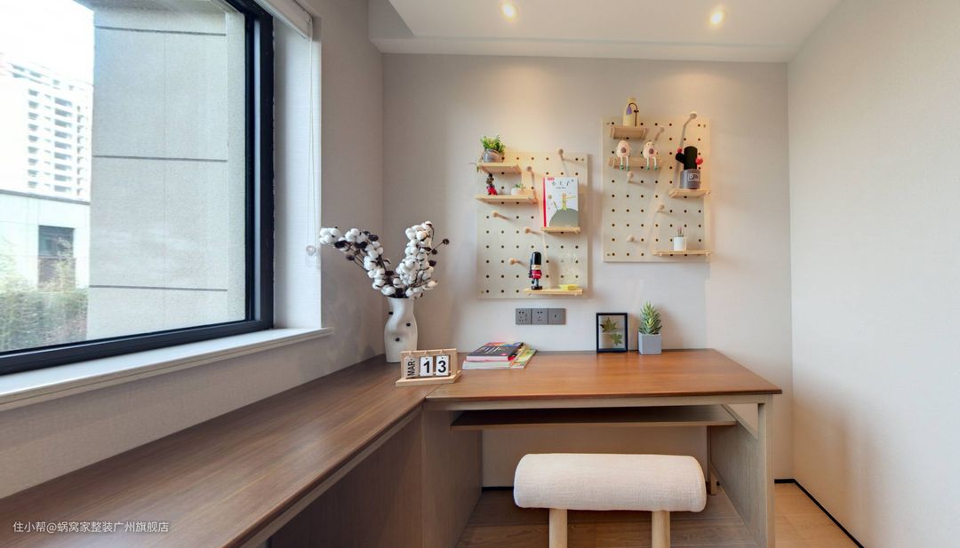 书房整体以白色背景为基底,靠墙打造了一整面木桌,桌面有着较大的范围,非常适合围读交流,轻易容纳多人共用。孩子写作业、家人办公都能在这里轻松展开。