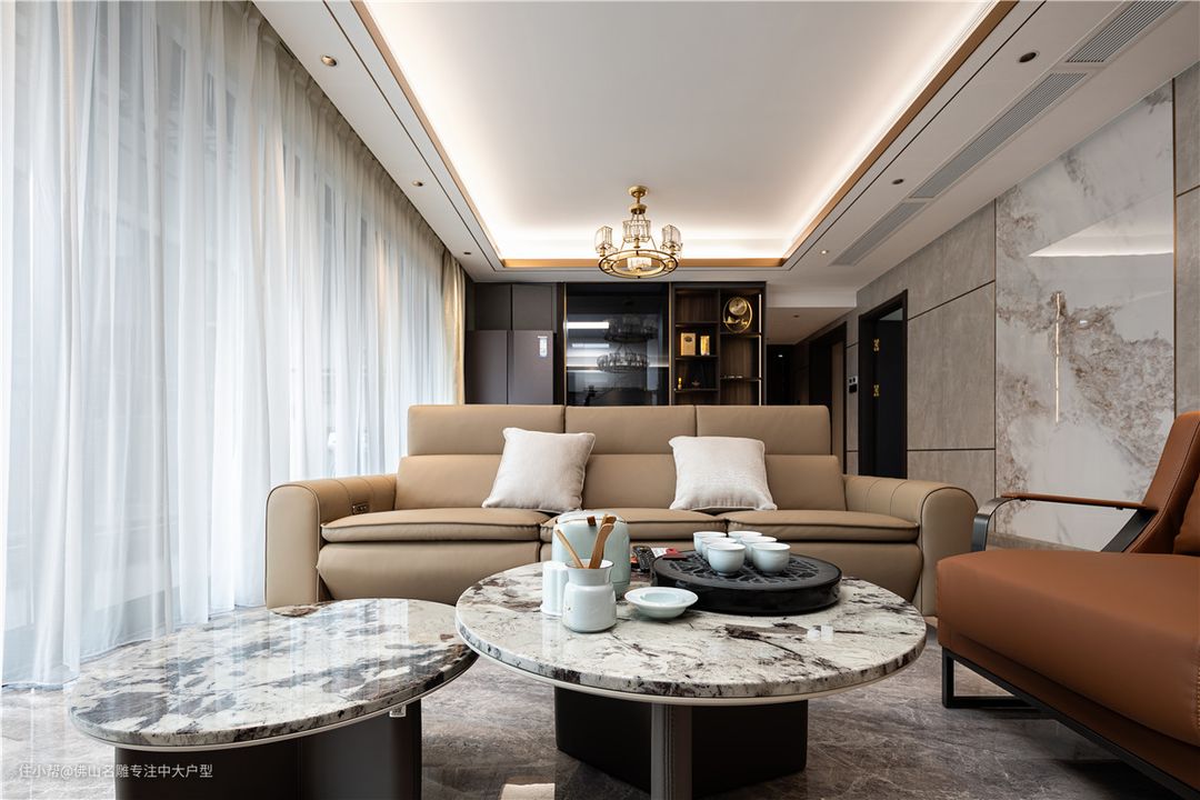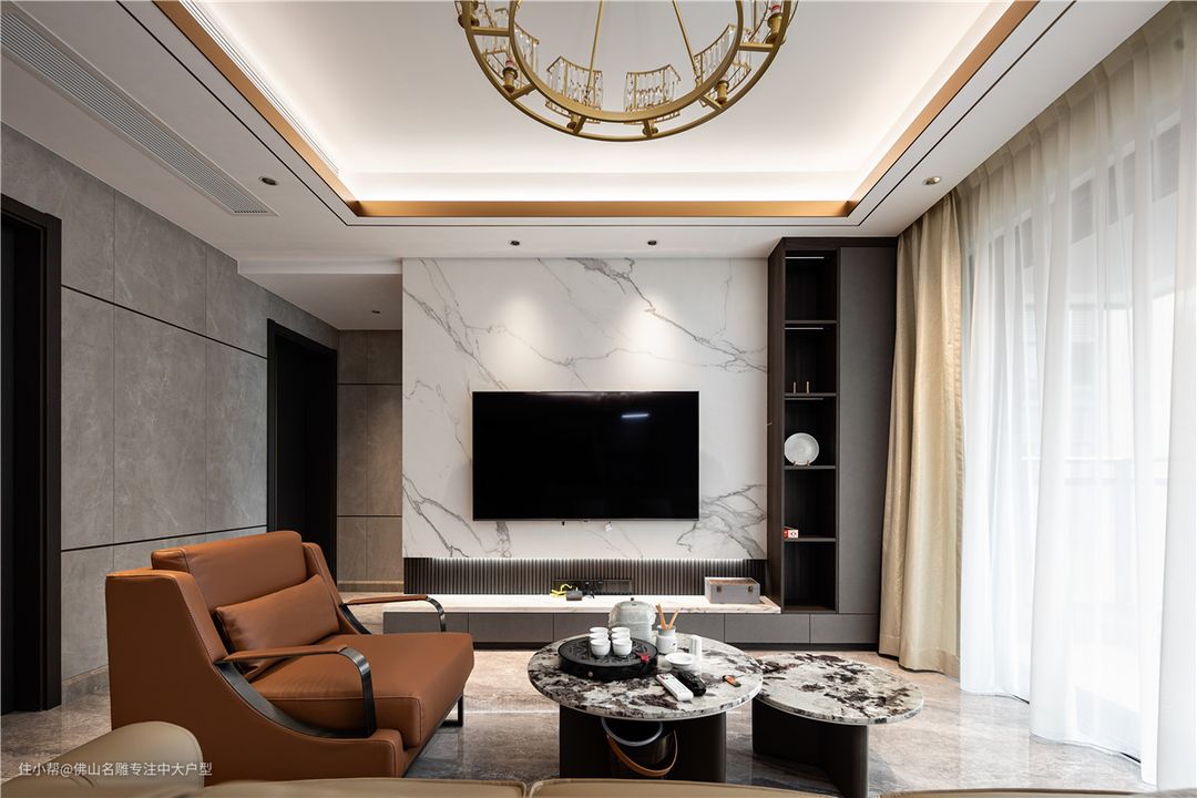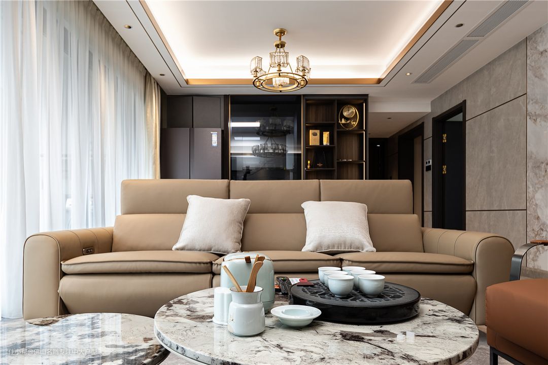客厅没有做复杂的背景墙,所有的墙壁包括电视背景墙都选择瓷砖通铺,色调统一又显大。 硬装软装的颜色不要过多过杂,6米宽的大横厅和阳台打通了,采光非常给力。 大马士革沙发饱满的造型可以带来慵懒惬意的使用体验,咖色的皮质也契合黑白灰空间的基调。