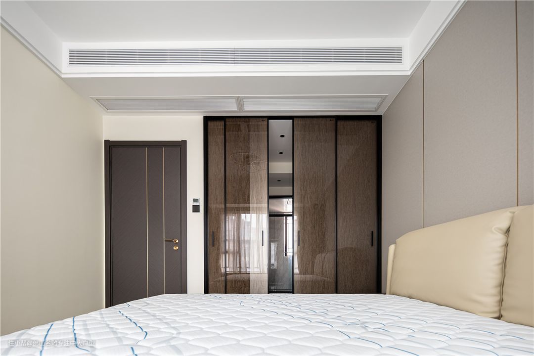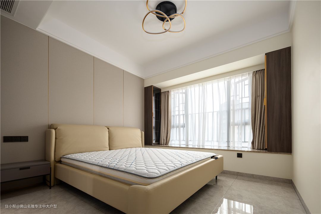 卧室选用一整块木饰面作为床头背景,浅色瓷砖与木饰面的颜色很相似,右侧飘窗两端设计了收纳柜,丰富了房间的储物功能。 房间的色调以清雅为主,营造一种慵懒而舒适的感觉,很符合慢一点的生活节奏, 顶面设置了灯带,烘托氛围让空间感更高级。