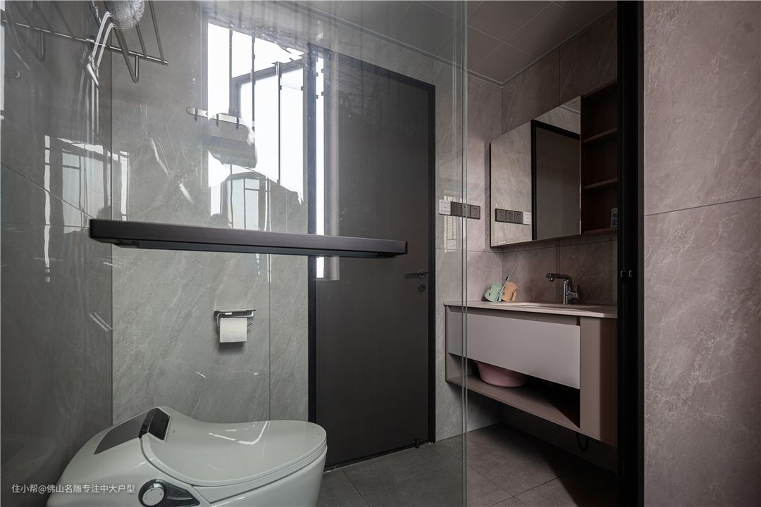 干净整洁的黑白风卫生间,布局是干湿二分离设计,上厕所和洗漱互不打扰。 地面和墙面都是灰色的瓷砖,比较耐脏,台盆和浴室柜灰白拼接,质感直接拉满。 淋浴区靠窗,方便通风,保持卫生间的干爽,百叶窗保护隐私的同时也不失美观。