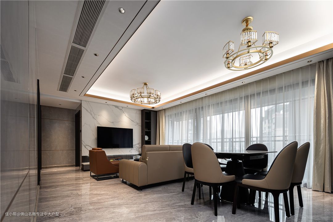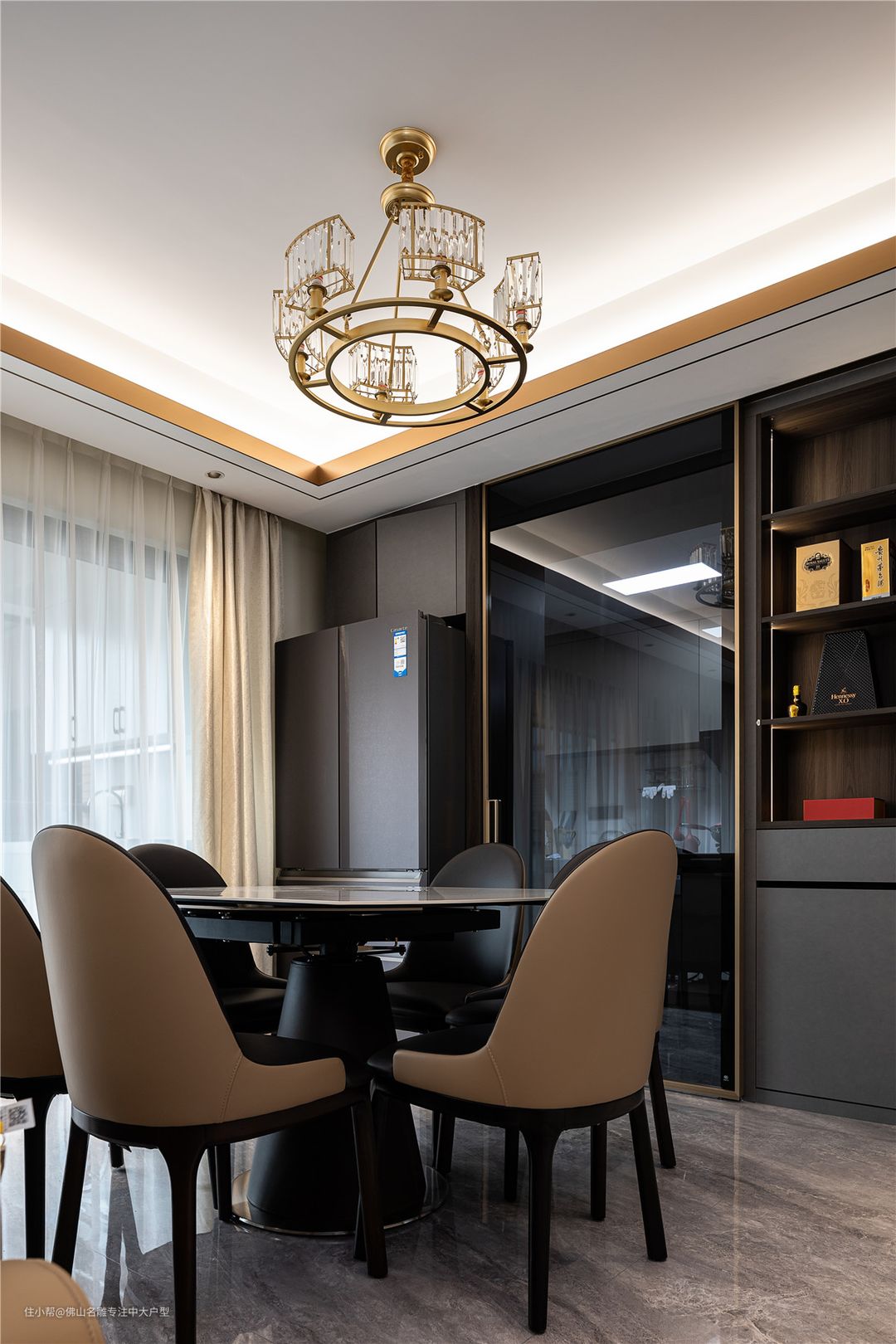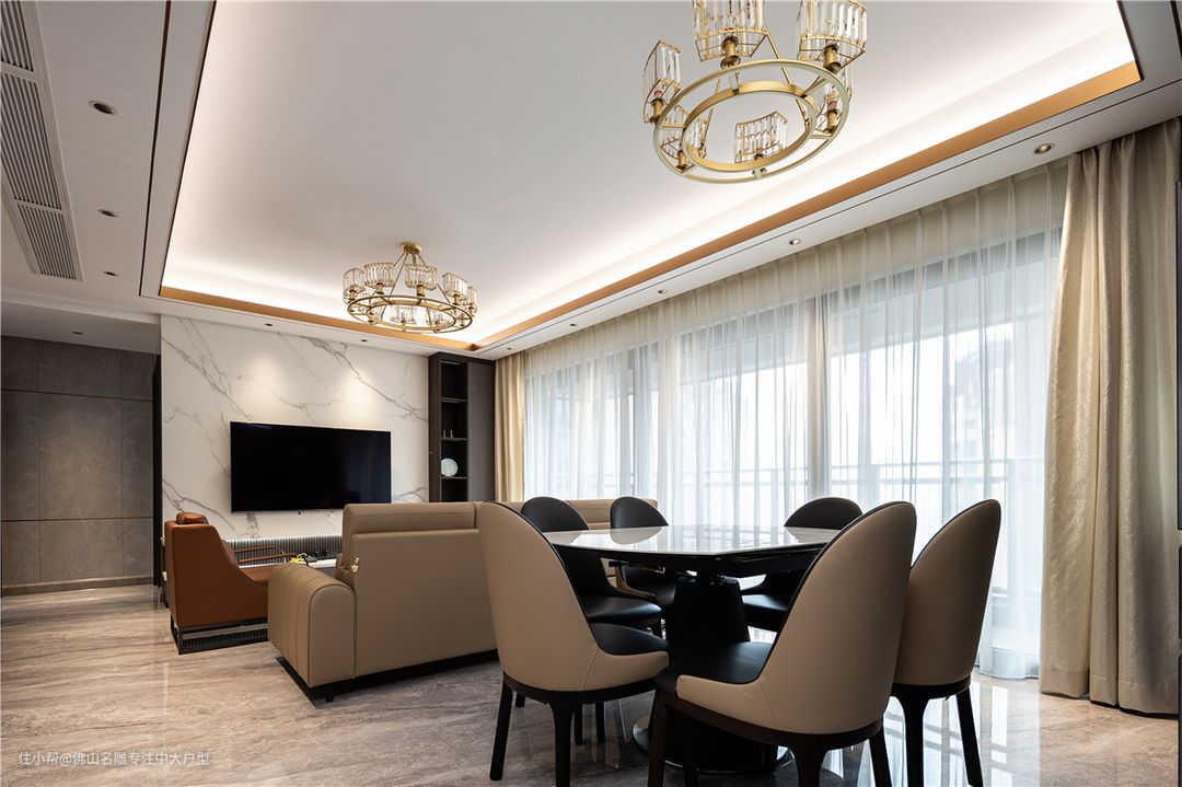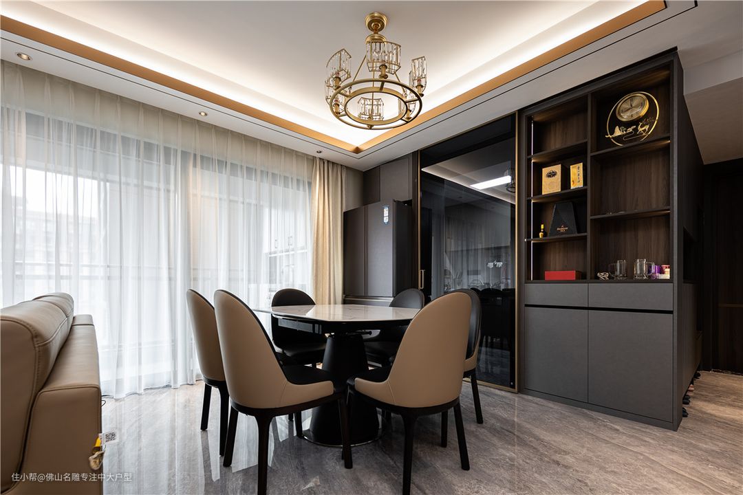 客餐厅一体式悬浮吊顶,中间无分割,视觉上更高级。家电也都是嵌入式的,与柜子融为一体。 仿大理石面餐桌,与奶茶色皮质靠椅,碰撞出轻奢高级感。整装酒柜,左侧玻璃门柜体,搭配层板后置灯带,打造极简轻奢 灯光氛围。满足客餐厅收纳功能,又让空间更为饱满有序。